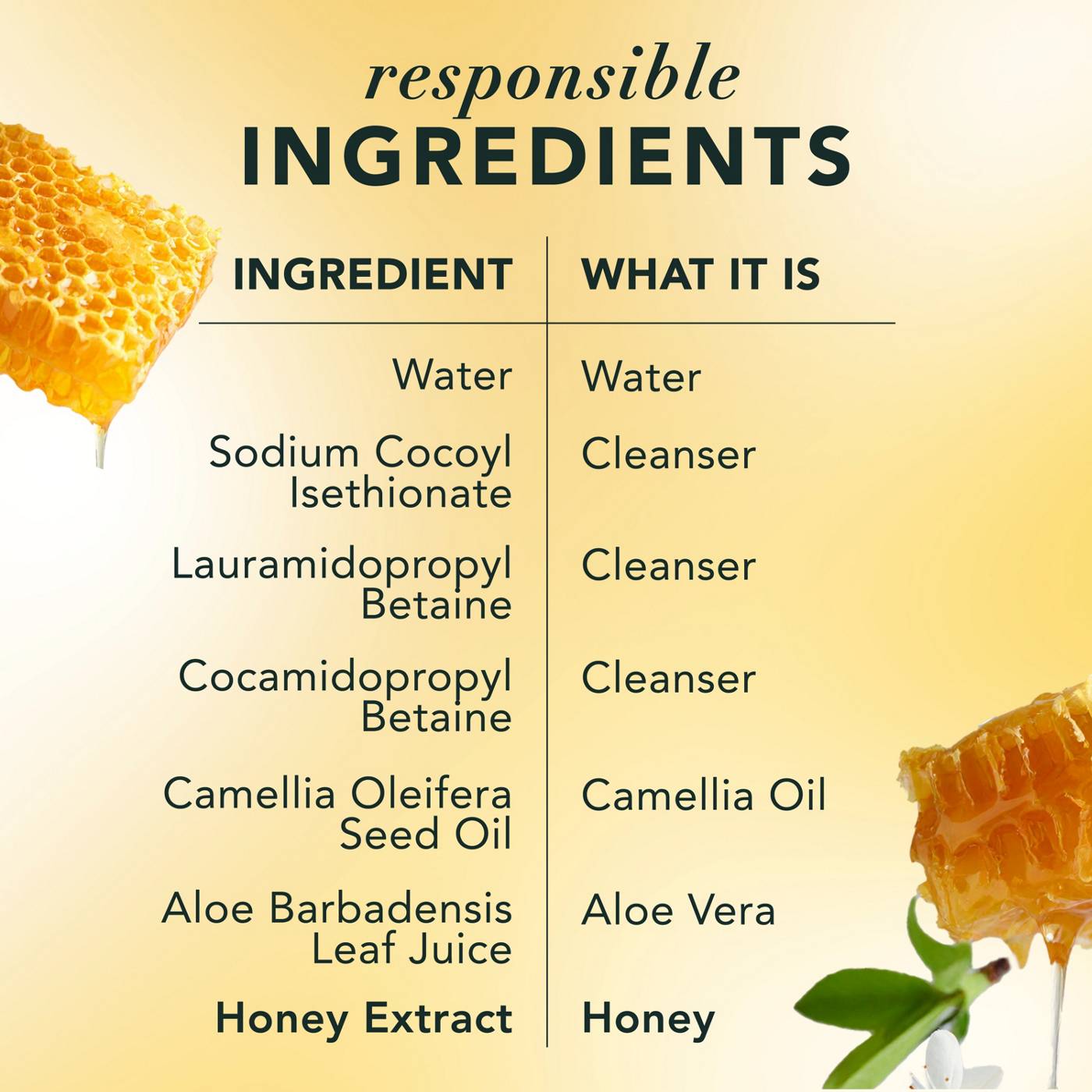 Water, Sodium Cocoyl Isethionate, Lauramidopropyl Betaine, Cocamidopropyl Betaine, Sodium Lauroyl Sarcosinate, Fragrance, Camellia Oleifera Seed Oil, Aloe Barbadensis Leaf Juice, Honey Extract, Histidine, Sodium Benzoate, Polyquaternium-10, Sodium Salicylate, Sodium Citrate, Citric Acid, Tetrasodium EDTA.