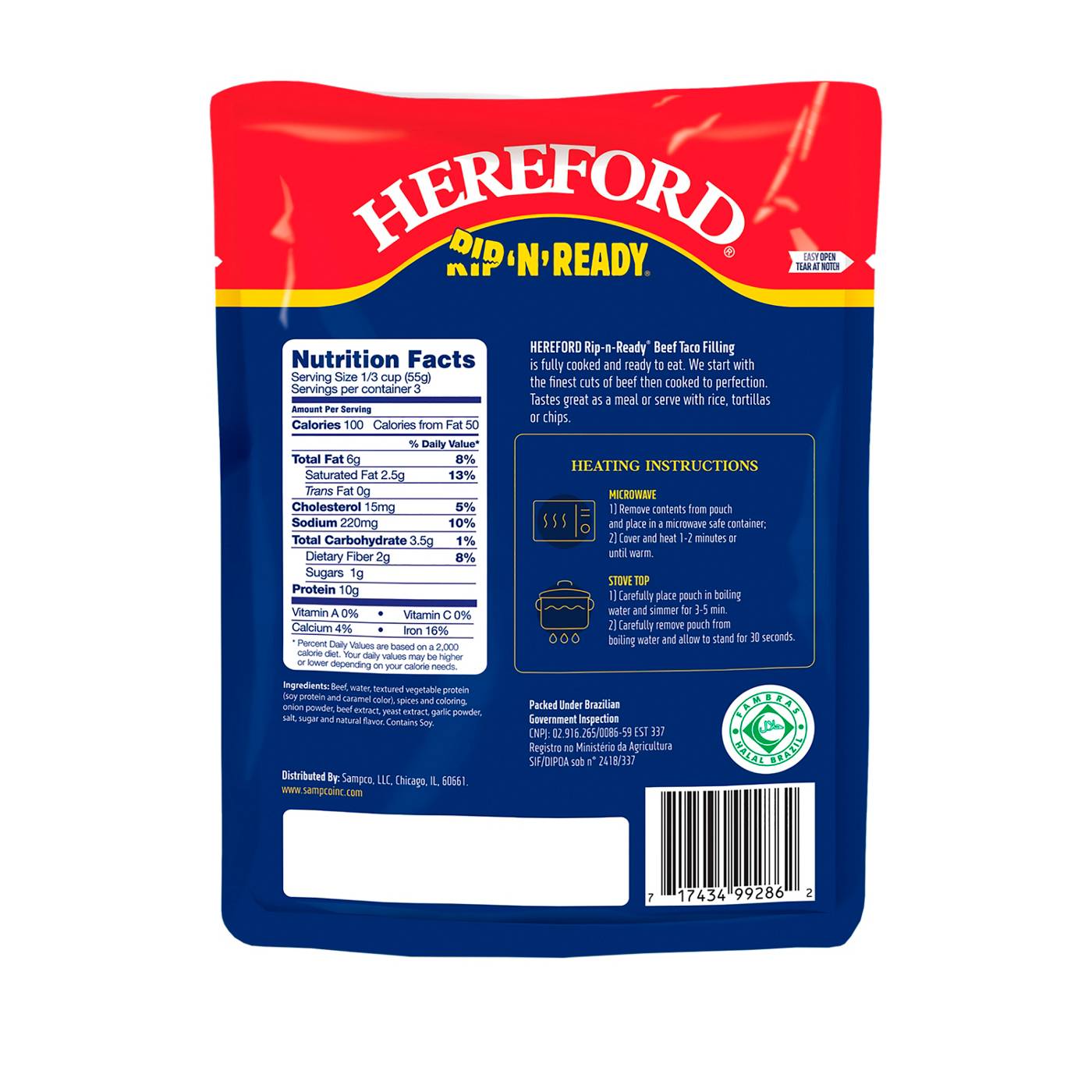 No MSG. Fully cooked, ready to eat! Beef raised with no added hormones. Hereford Rip-n-Ready Beef Taco Filling is fully cooked and ready to eat. We start with the finest cuts of beef then cooked to perfection.