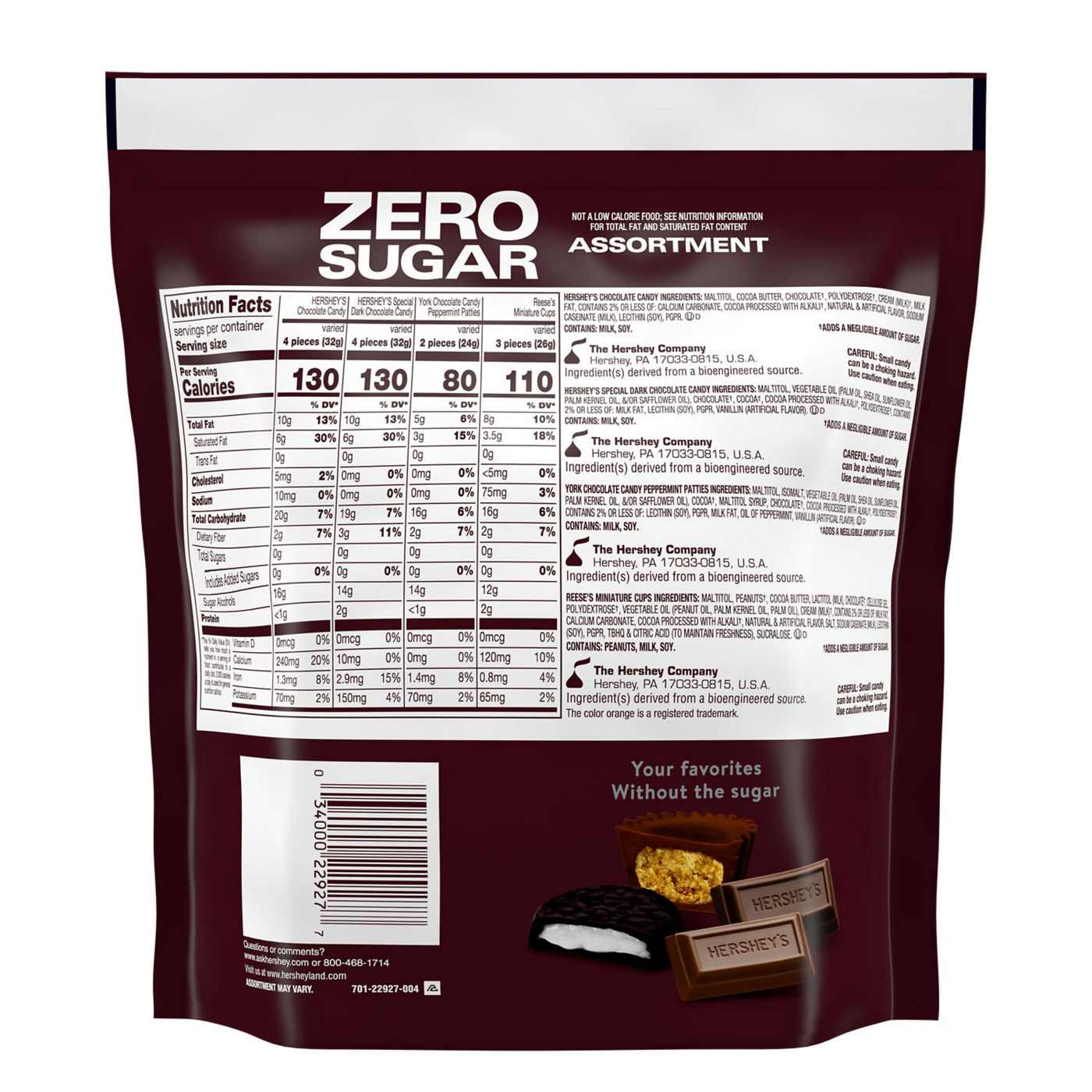 Enjoy a delicious chocolatey treat anytime and anywhere with Hershey's, Reese's And York Zero Sugar assorted chocolate candy, perfect for holidays, special events and everyday occasions. Offering four crowd-pleasing favorites, this candy assortment is perfect for sharing with family, friends, teammates or co-workers. This assorted bag of sugar free chocolate candies contains Hershey's Special Dark chocolate candy bars, Hershey's chocolate candy bars, Reese's chocolate candy and peanut butter cups and York chocolate candy covered peppermint patties..