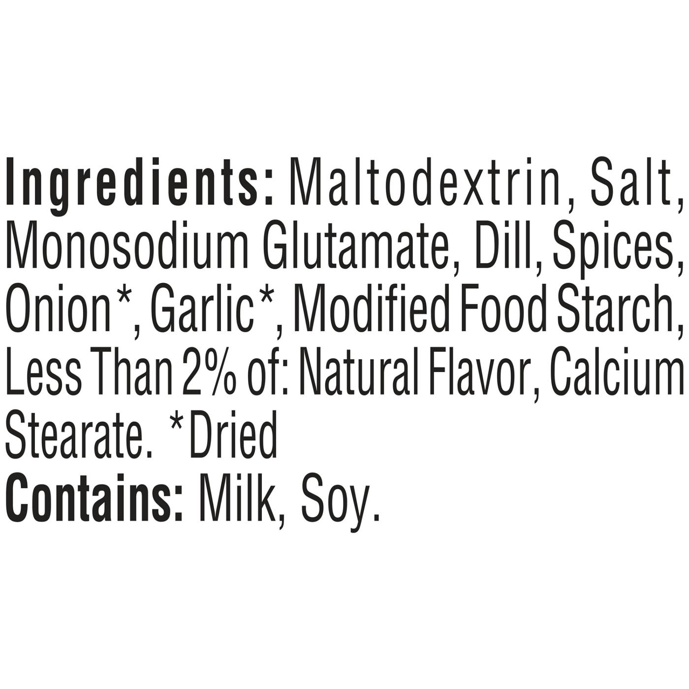 Maltodextrin, Salt, Monosodium Glutamate, Dill, Spices, Onion (1), Garlic (1), Modified Food Starch, Less Than 2% of: Natural Flavor, Calcium Stearate. (1) Dried. Contains: Milk, Soy.Allergens and safety warnings