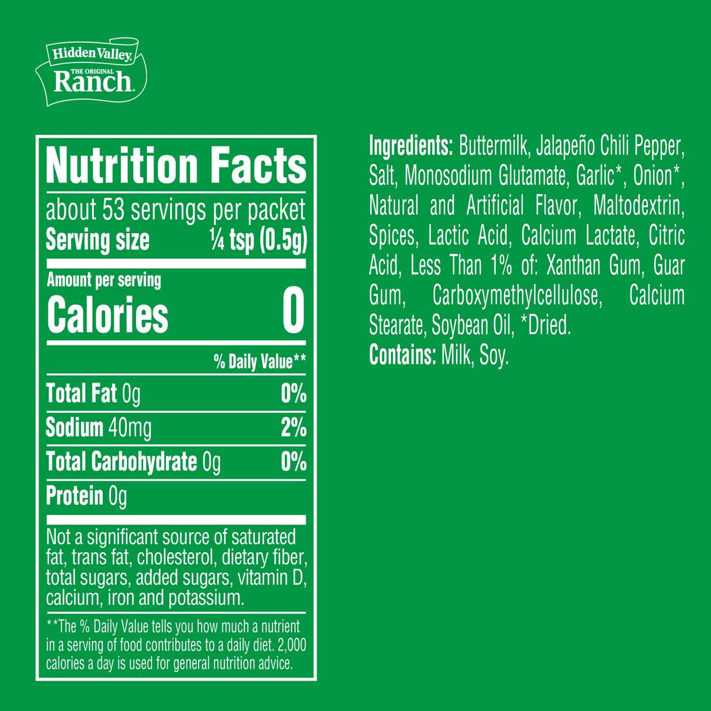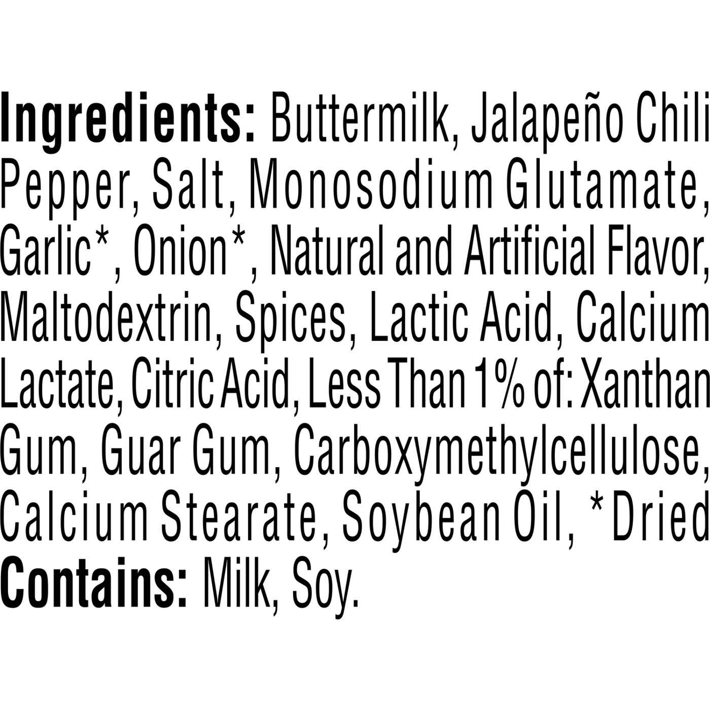 Buttermilk, Jalapeno Chili Pepper, Salt, Monosodium Glutamate, Garlic*, Onion*, Natural and Artificial Flavor, Maltodextrin, Spices, Lactic Acid, Calcium Lactate, Citric Acid, Less Than 1 % of: Xanthan Gum, Guar Gum, Carboxymethylcellulose, Calcium Stearate, Soybean Oil, *Dried Contains: Milk, Soy.Allergens and safety warnings