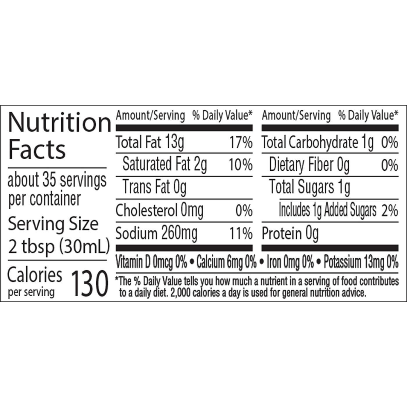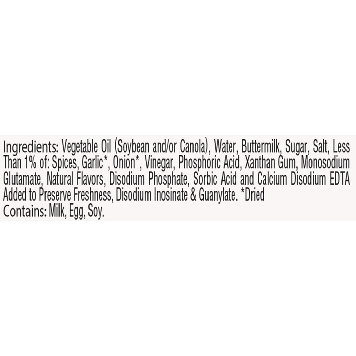 Vegetable Oil (Soybean and/or Canola), Water, Buttermilk, Sugar, Salt, Less than 1% of: Spices Garlic*, Onion*, Vinegar, Phosphoric Acid, Xanthan Gum, Monosodium Glutamate, Natural Flavors, Disodium Phosphate, Sorbic Acid and Calcium Disodium EDTA Added to Preserve Freshness, Disodium Inosinate and Guanylate. *Dried Contains: Milk, Egg, Soy.Allergens and safety warnings