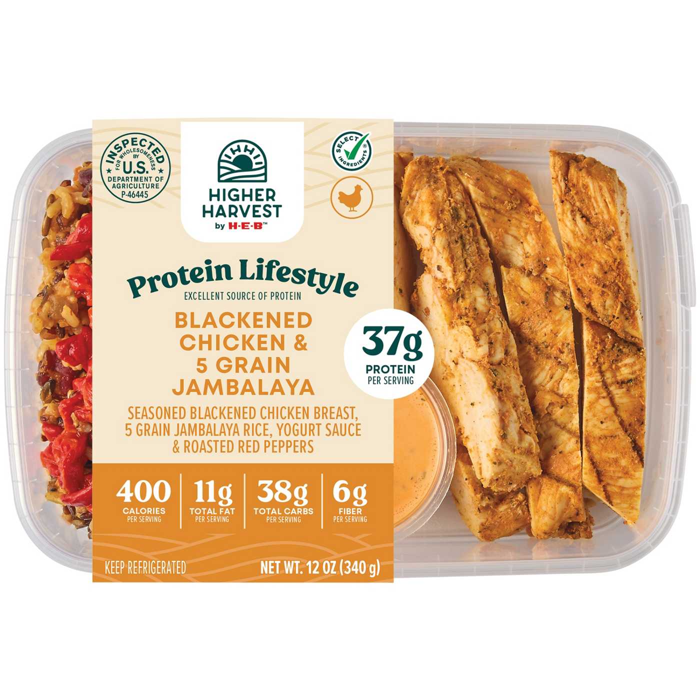 Indulge in the chef-curated excellence of the Higher Harvest by H-E-B Blackened Chicken & 5 Grain Jambalaya Bowl. This nutritious meal offers 37 grams of protein, featuring seasoned blackened chicken breast, 5 grain jambalaya rice, roasted red peppers and yogurt sauce, this bowl delivers a delightful blend of distinct flavors and satisfying textures. Perfect for saving time from meal prepping, it provides a nutritious, gourmet dining experience in under 2 minutes.
