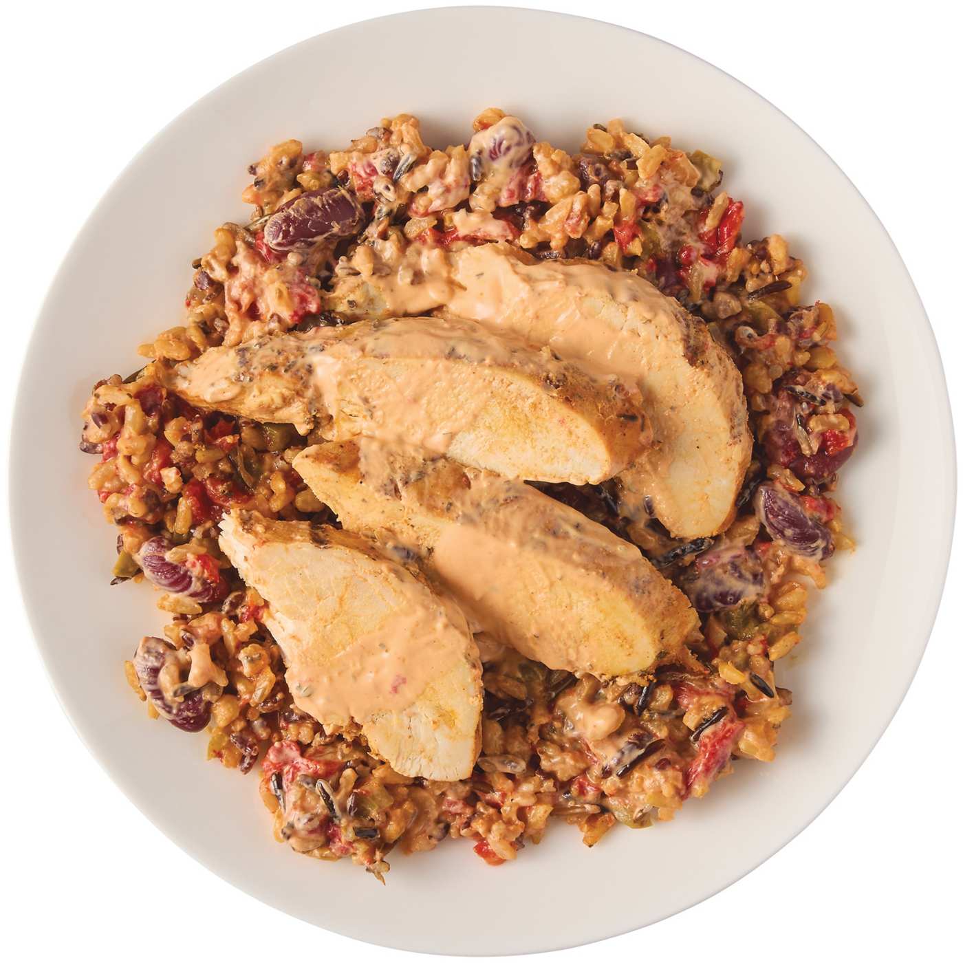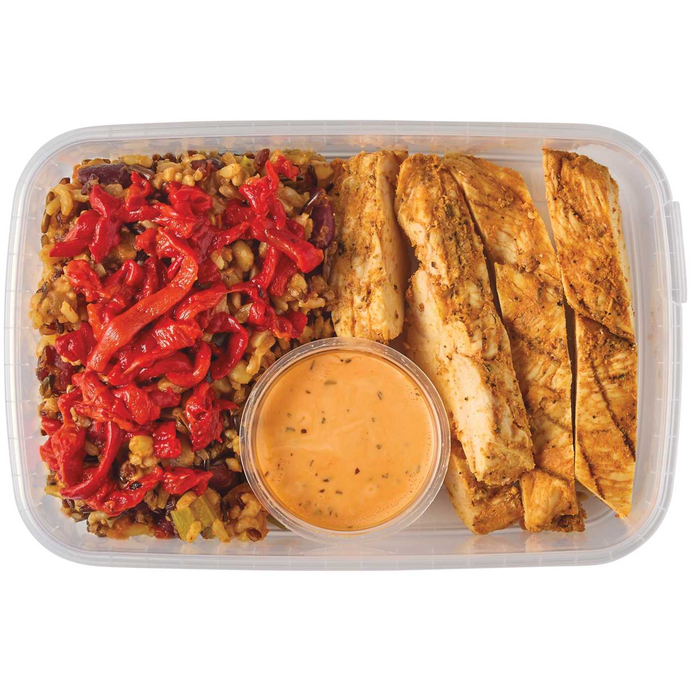 5 Grain Jambalaya (Water, Tomatoes [Tomatoes, Tomato Juice, Citric Acid], Whole Grain Blend [Long Grain Brown Rice, Grano {Pearled Durum Wheat}, Red Rice, Medium Grain Brown Rice, Wild Rice], Onions, Kidney Beans [Dark Red Kidney Beans, Water, Salt, Calcium Chloride], Green Bell Pepper, Celery, Garlic Puree [Garlic, Citric Acid, Ascorbic Acid {To Maintain Color}], Canola Oil, Tomato Paste [Tomatoes, Citric Acid], Chicken Flavor [Chicken Broth, Chicken Flavor, Salt, Cane Sugar, Onion Powder, Corn Starch, Natural Flavor, Turmeric], Spices, Thyme), Seasoned Blackened Chicken (Chicken Breast [Chicken Breast, Brine {Water, Sodium Phosphates, Salt}], Marinade [Canola Oil, Water, Spices {Including Paprika}, Onion Powder, Garlic Powder]), Yogurt Sauce (Plain Non-Fat Yogurt [Cultured Nonfat Milk], Garlic Puree [Garlic, Citric Acid, Ascorbic Acid {To Maintain Color}], Lemon Juice Concentrate, Salt, Oleoresin Paprika [Canola Oil, Natural Extractives Of Paprika], Parsley, Garlic Powder), Roasted Red Peppers (Roasted Red Peppers, Water, Salt, Citric Acid).Allergens and safety warnings
