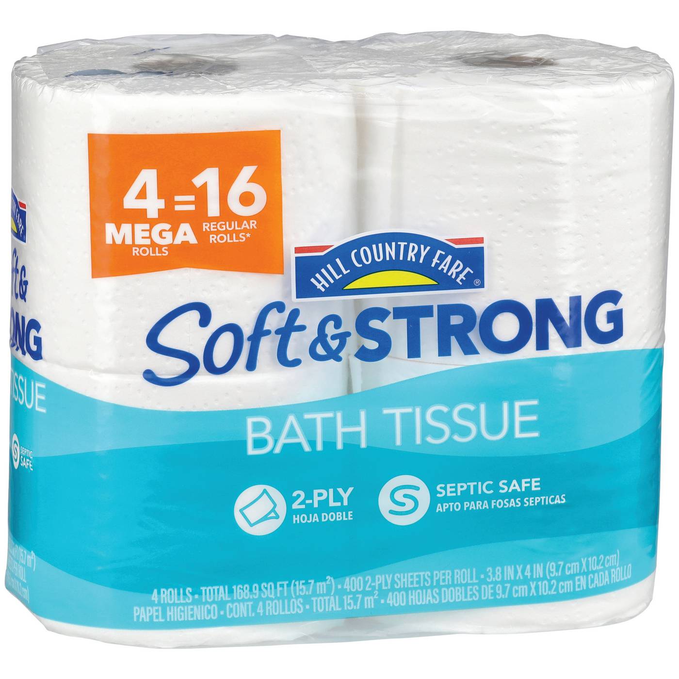 Equaling 16 regular-size rolls, these 4 Mega rolls of Hill Country Fare toilet paper are a longer lasting addition to your bathroom cabinet. Soft and strong, these 2-ply sheets provide a confident clean and are septic-safe. Enjoy changing the roll less often by getting 4X the bath tissue per roll.