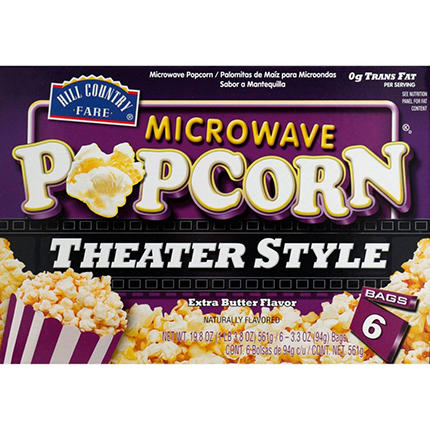 • Six 3.3-oz bags of theater-style microwave popcorn with extra butter flavor