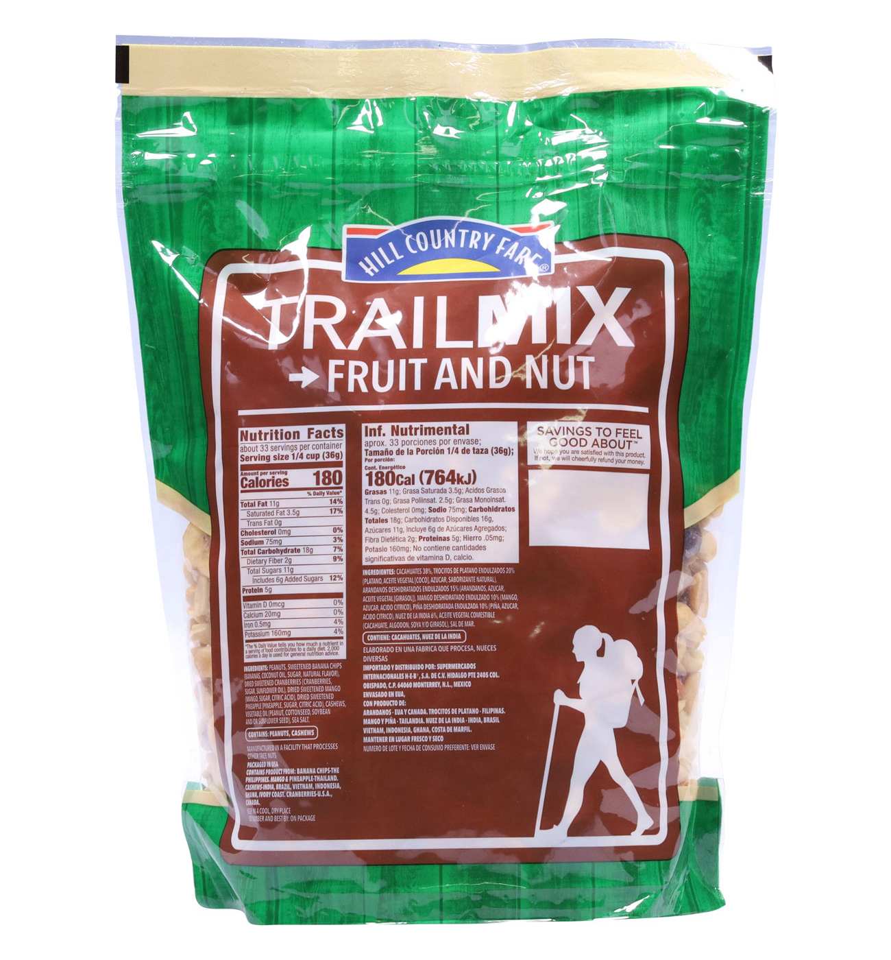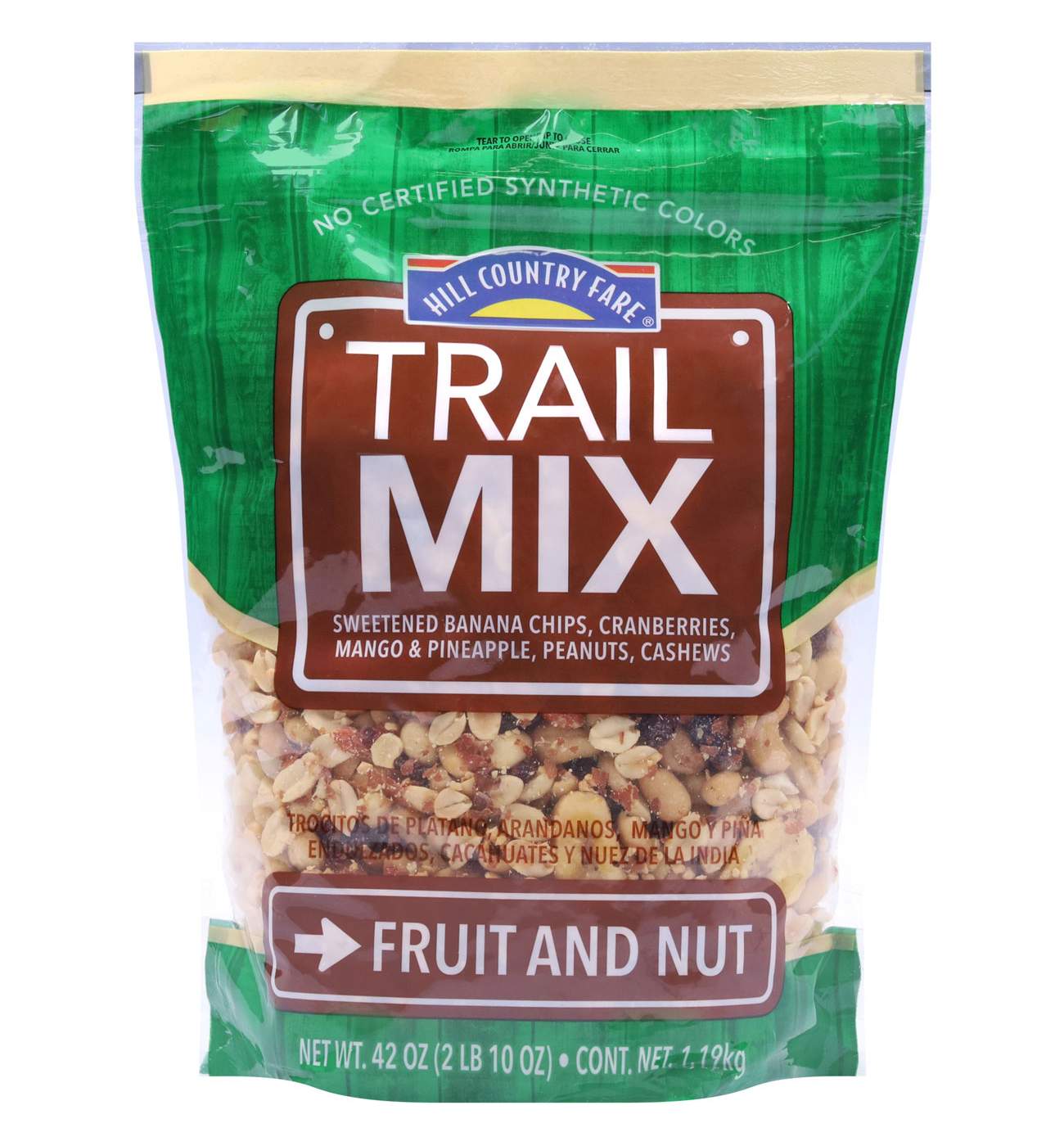 For a tropical twist on trail mix, pick up this bag of Hill Country Fare Fruit & Nut. It's packed with sweetened banana chips, mango, pineapple, dried cranberries, peanuts and cashews. Snack away and enjoy the terrific texture and taste. No certified synthetic colors.