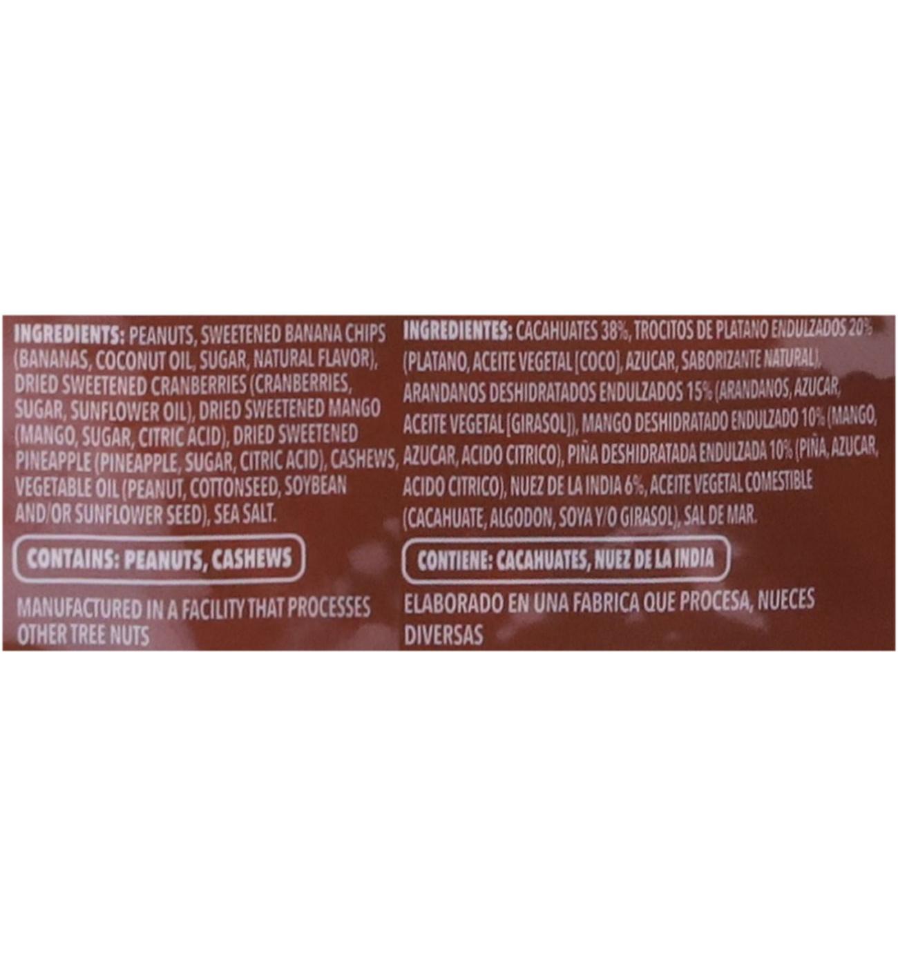 Peanuts, Sweetened Banana Chips (Bananas, Coconut Oil, Sugar, Natural Flavor), Dried Sweetened Cranberries (Cranberries, Sugar, Sunflower Oil), Dried Sweetened Mango (Mango, Sugar, Citric Acid), Dried Sweetened Pineapple (Pineapple, Sugar, Citric Acid), Cashews, Vegetable Oil (Peanuts, Cottonseed, Soybean and/or Sunflower Seed), Sea Salt.Allergens and safety warnings