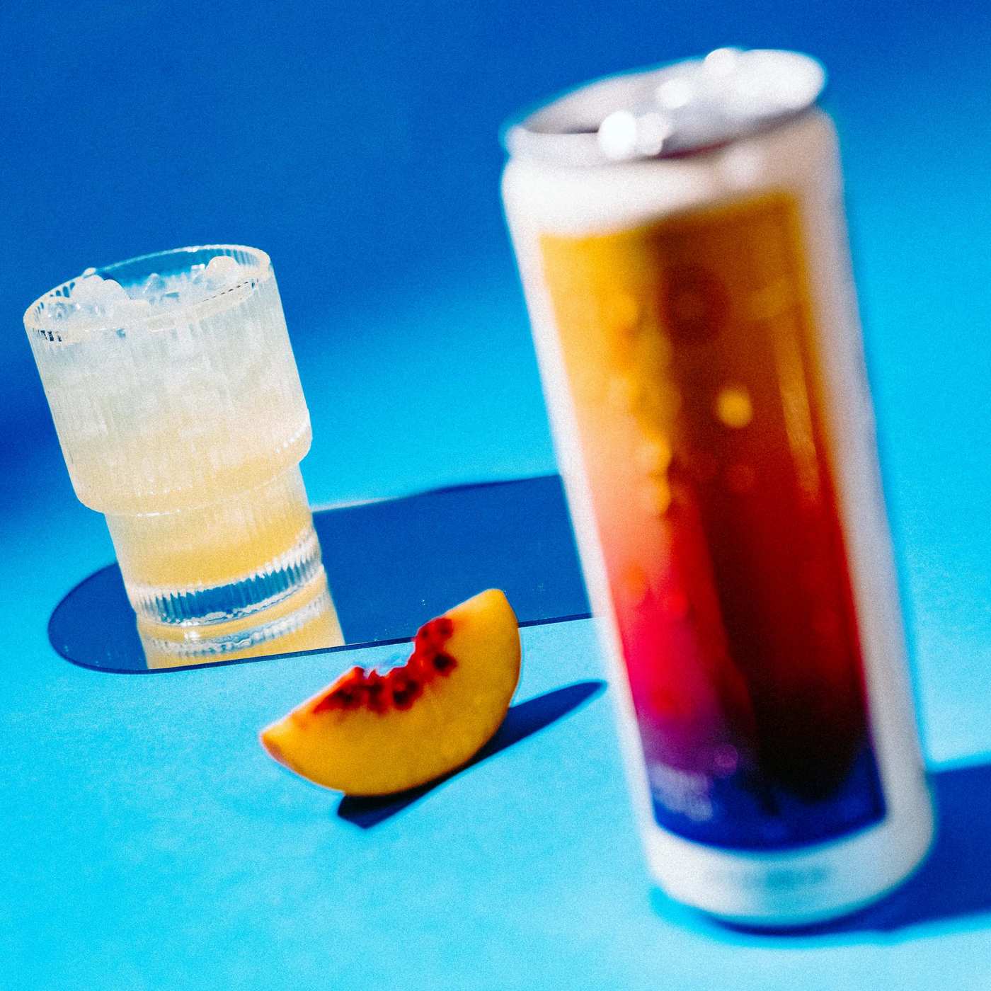 Carbonated Filtered Water, Organic Erythritol, Organic Flavors, Organic Cane Sugar, Organic Peach Juice Concentrate, Organic Mango Juice Concentrate, Organic Lemon Balm Extract, Organic Gum Acacia, Organic Ksm-66 Ashwagandha Extract, Organic Fruit and Vegetable Juice (Color), Citric Acid, Organic Orange Juice Concentrate, Organic Passion Flower Extract, Organic Green Tea Extract* (I-Theanine), Organic Ginger Extract, Organic Lion's Mane Mushroom Extract, Riboflavin (Vitamin B2). * Non-Caffeinated.