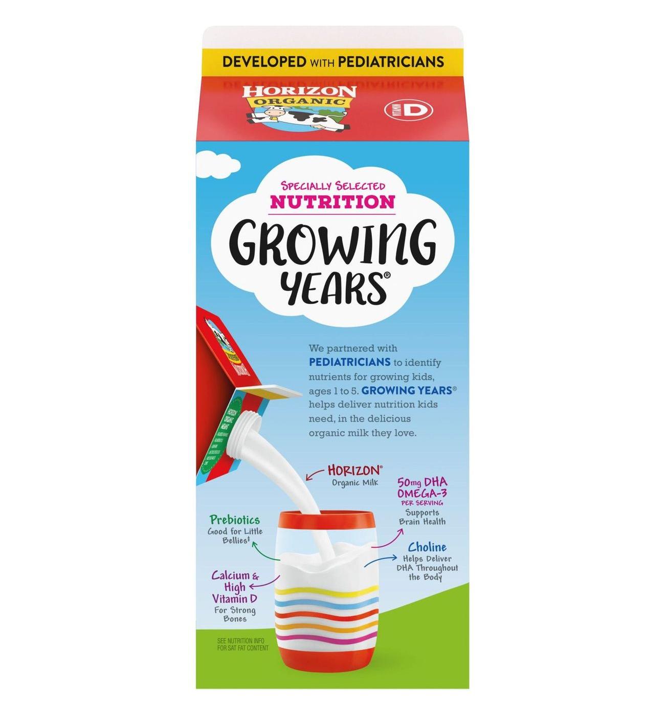 Horizon Organic Growing Years Whole Milk with DHA Omega-3 helps deliver your kids the nutrients they need in the great-tasting organic milk they love. This organic whole milk was developed with pediatricians and includes 13 essential nutrients for growing kids. Each delicious serving of this ultra pasteurized milk provides 50mg DHA Omega-3 to help support brain health and eye health and has choline, which helps transport DHA throughout the body. Horizon Organic Growing Years organic whole milk for kids also contains prebiotics, which are good for little bellies.* Horizon Organic Growing Years Whole Milk contains 8g protein per serving**, calcium, and high vitamin D**, which help support strong bones. Always USDA Certified Organic, every Horizon milk carton comes from cows cared for by trusted farmers. Plus, it comes from cows that are fed non-GMO feed and not treated with antibiotics or growth hormones.*** At Horizon Organic, we believe that organic farming can drive healthier, more sustainable food communities for our world. *Prebiotics feed the good bacteria in the gut. 1g prebiotics per serving. Serve as part of a balanced diet. **See nutrition facts for sat. fat content. ***No significant difference has been shown between milk with rBST-treated and non rBST-treated cows. ****Per National Organic Program Regulations.•Organic Whole Milk for Kids: One 59 fl oz carton of Horizon Organic Growing Years DHA Omega-3 Whole Milk helps deliver nutrients growing kids need•Supports Brain Health: DHA whole milk has 50mg DHA Omega-3 per serving to help support brain and eye health, and choline to transport DHA in the body•Developed with Pediatricians: Horizon Organic Growing Years Whole Milk was developed with pediatricians and includes key nutrients for kids•Essential Nutrients: Each 1 cup serving of organic whole milk has 8g protein** and nutrients kids need, including calcium, vitamin D, and prebiotics•Horizon Organic Farming Means: No prohibited pesticides used, no growth hormones used***, no antibiotics used, non-GMO, and pasture-raised**** cows