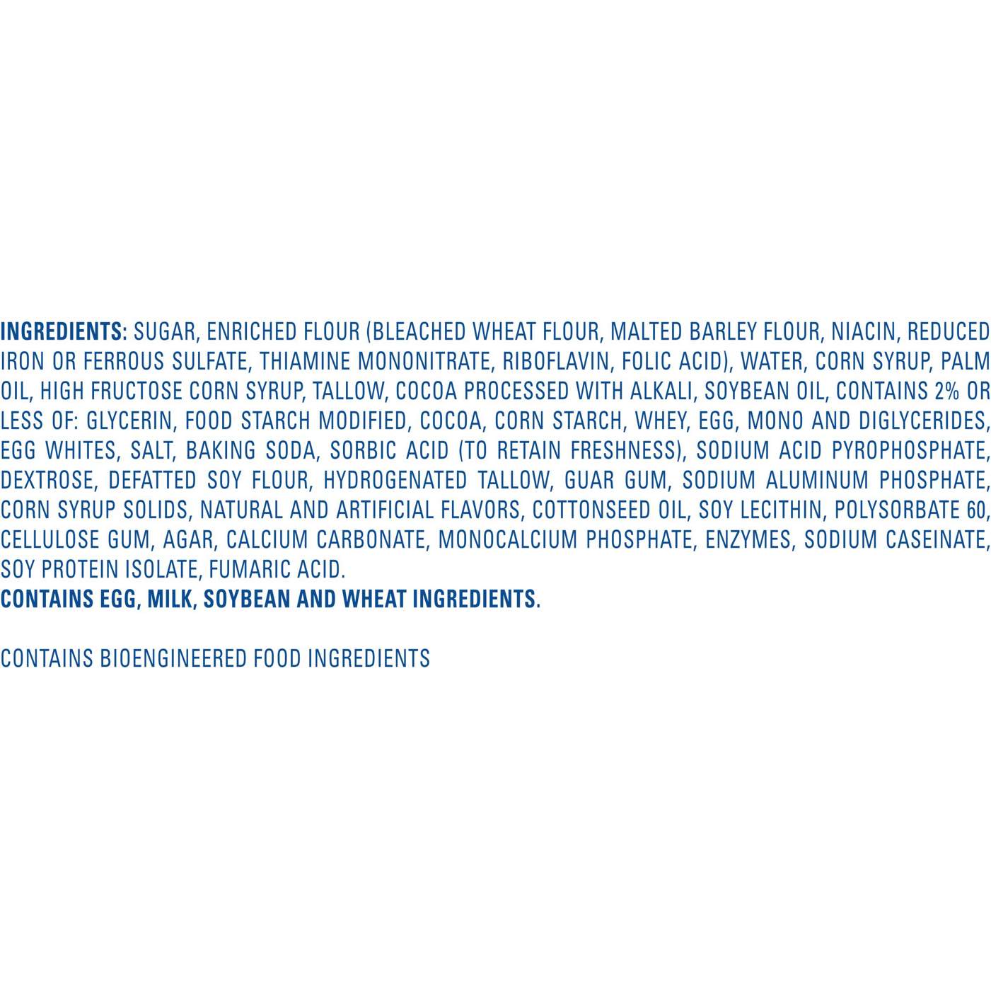 Sugar, Water, Enriched Flour (Bleached Wheat Flour, Malted Barley Flour, Niacin, Ferrous Sulfate Or Reduced Iron, Thiamine Mononitrate, Riboflavin, Folic Acid), Palm Oil, Corn Syrup, High Fructose Corn Syrup, Tallow, Cocoa Processed With Alkali, Contains2% Or Less: Glycerin, Modified Food Starch, Soybean Oil, Cocoa, Egg, Whey, Mono And Diglycerides, Egg White, Baking Soda, Hydrogenated Tallow, Natural And Artificial Flavors, Salt, Defatted Soy Flour, Sodium Acid Pyrophosphate, Sorbic Acid (To Retain Freshness), Dextrose, Enzymes, Cellulose Gum, Sodium Aluminum Phosphate, Cottonseed Oil, Guar Gum, Polysorbate 60, Monocalcium Phosphate, Agar, Soy Lecithin, Fumaric Acid, Calcium Caseinate, Sodium Caseinate, Soy Protein Isolate.Allergens and safety warnings