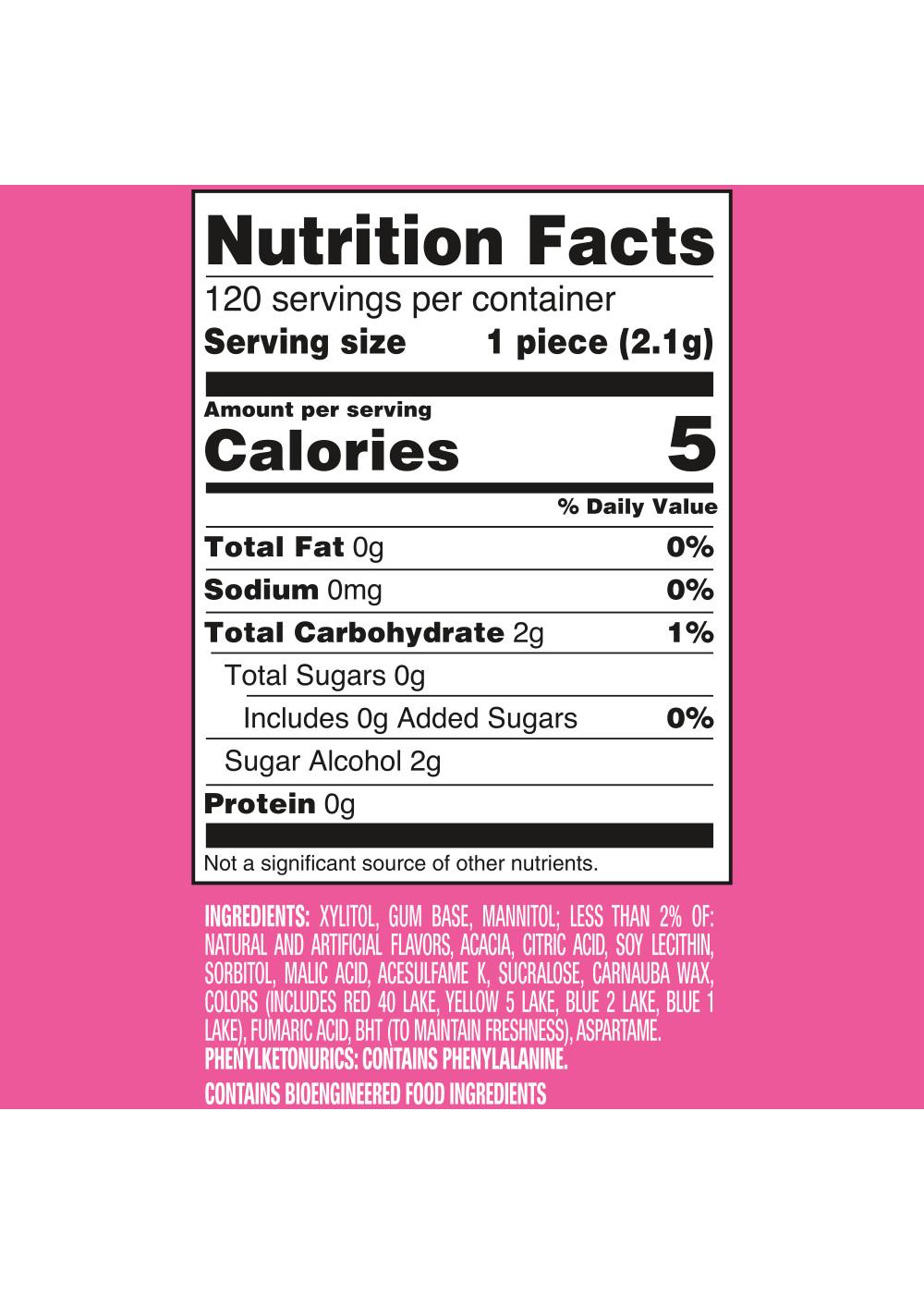 Xylitol, Gum Base, Mannitol; Less Than 2% Of: Natural And Artificial Flavors, Acacia, Citric Acid, Soy Lecithin, Sorbitol, Malic Acid, Acesulfame K, Sucralose, Carnauba Wax, Colors (Includes Red 40 Lake, Yellow 5 Lake, Blue 2 Lake, Blue 1 Lake), Fumaric Acid, Bht (To Maintain Freshness), Aspartame.