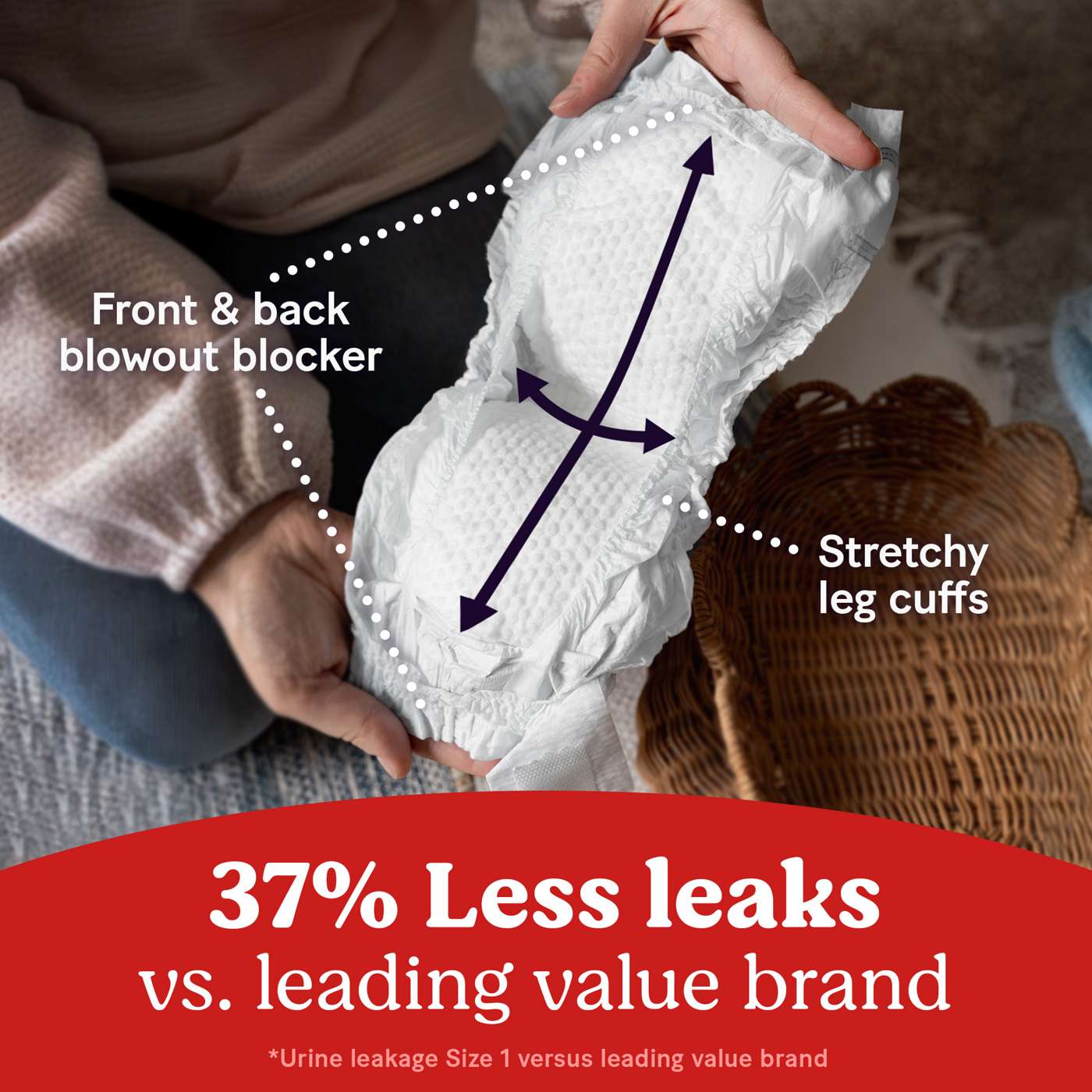 • A soft, back pocketed waistband helps prevent leaks and blowouts and helps keep mess away from your baby's skin