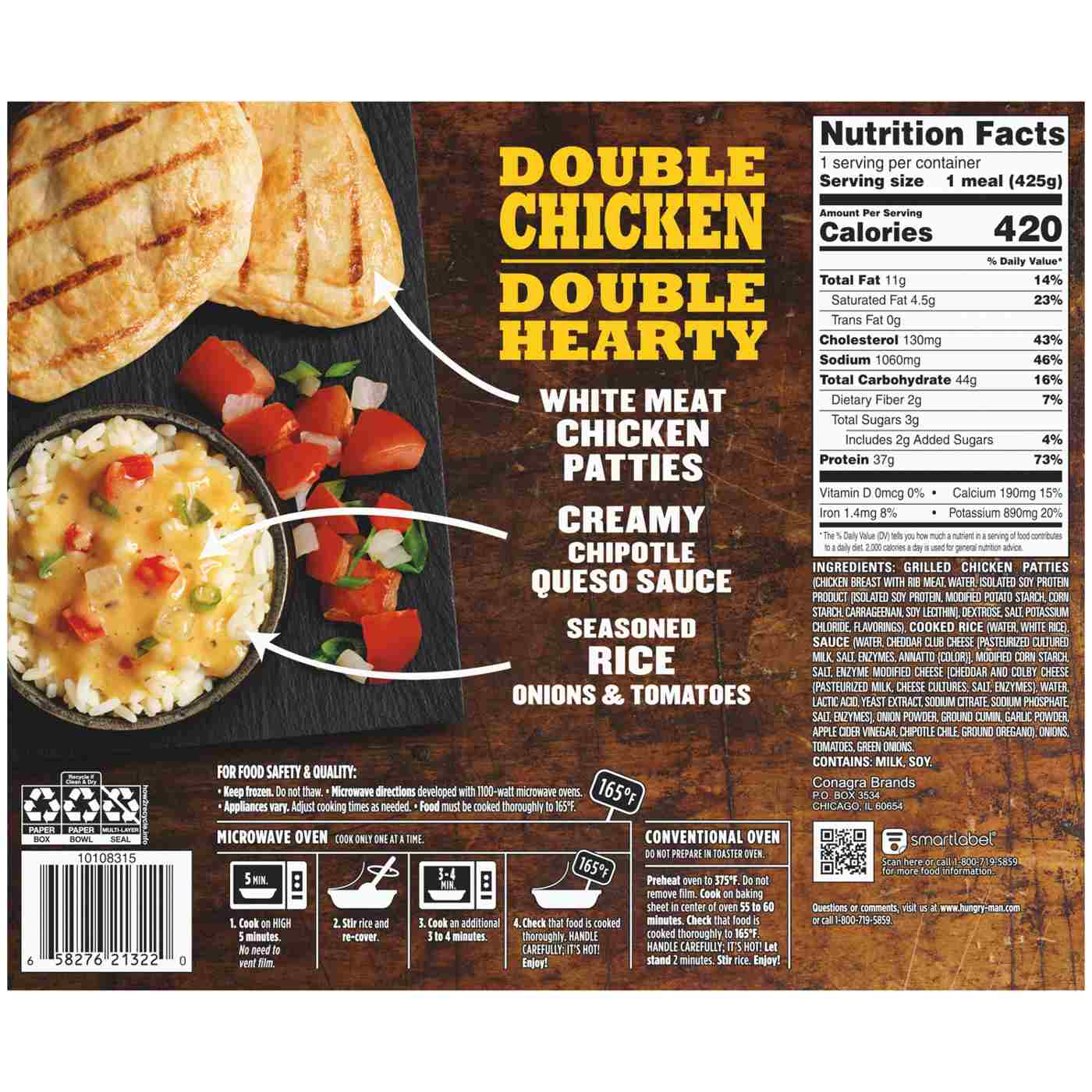 What's better than chipotle chicken? More chipotle chicken AND rice. Get two times the chipotle chicken with a Hungry-Man Double Meat Bowls Chipotle Chicken and Rice Frozen Meal. Two boneless white meat chicken patties, creamy chipotle queso sauce and seasoned rice with onions and tomatoes are perfect for hearty appetites. These convenient frozen meals are ideal for lunches, dinners or anytime meals, and contain 37 grams of protein per serving. Delicious and filling portions ... that's Hungry-Man.