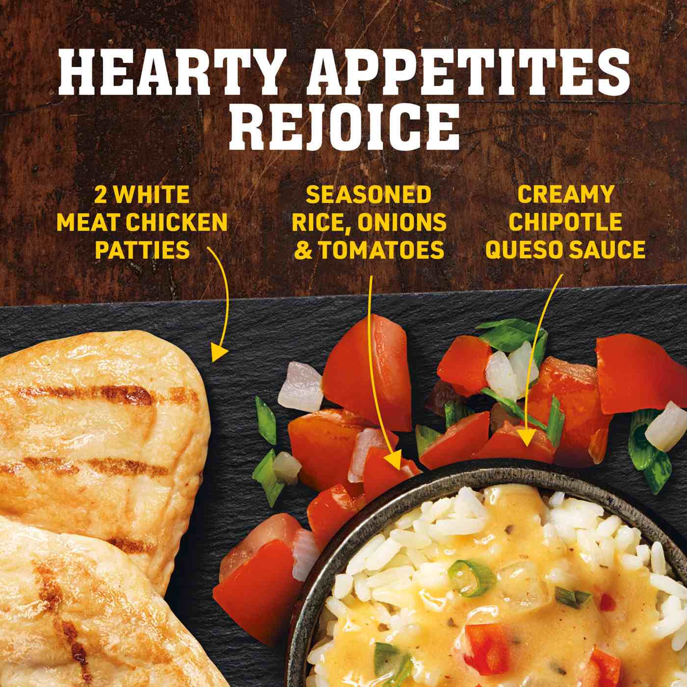 -Satisfy your cravings with two boneless white meat chicken patties, creamy chipotle queso sauce and seasoned rice with onions and tomatoes
