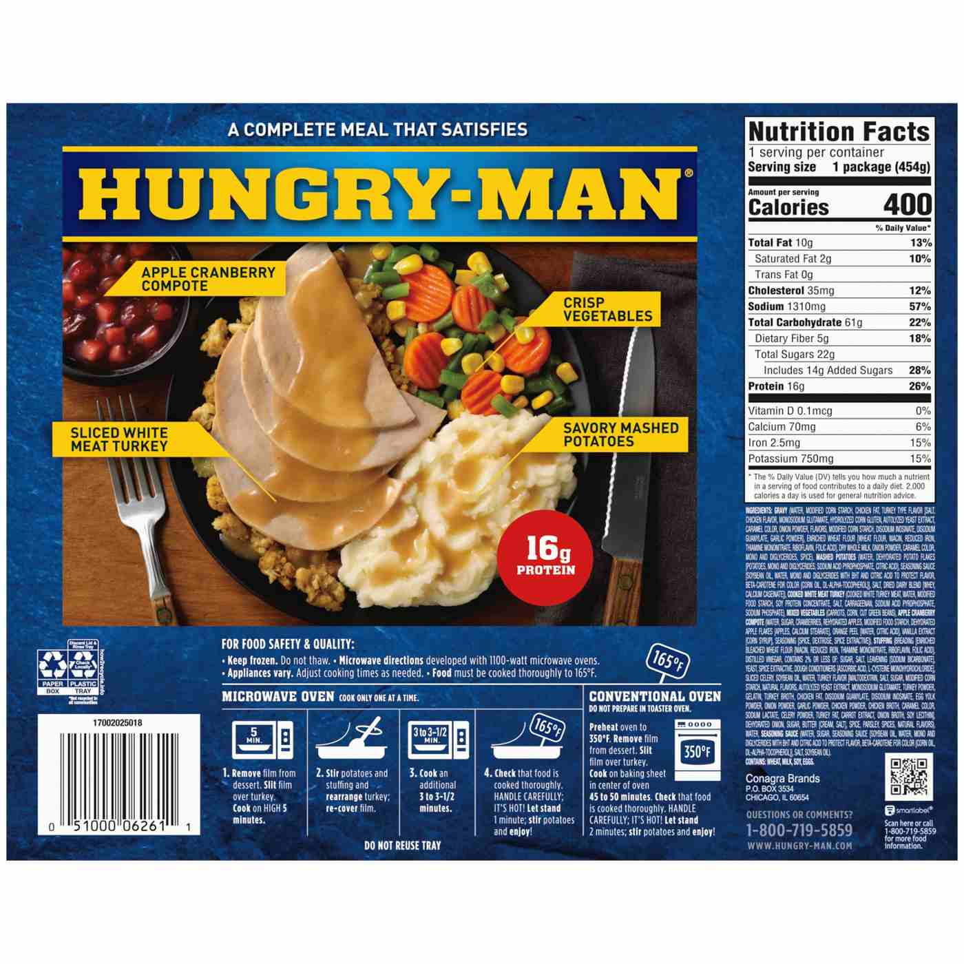 Satisfy your man-size hunger with a Hungry Man Roasted Turkey Breast Frozen Dinner. Dive into roasted white-meat turkey, creamy mashed potatoes, gravy, mixed vegetables, seasoned stuffing and apple cranberry compote. Quick and convenient, these microwavable meals are great for lunch, dinner or anytime. Eat like a man, with Hungry Man.