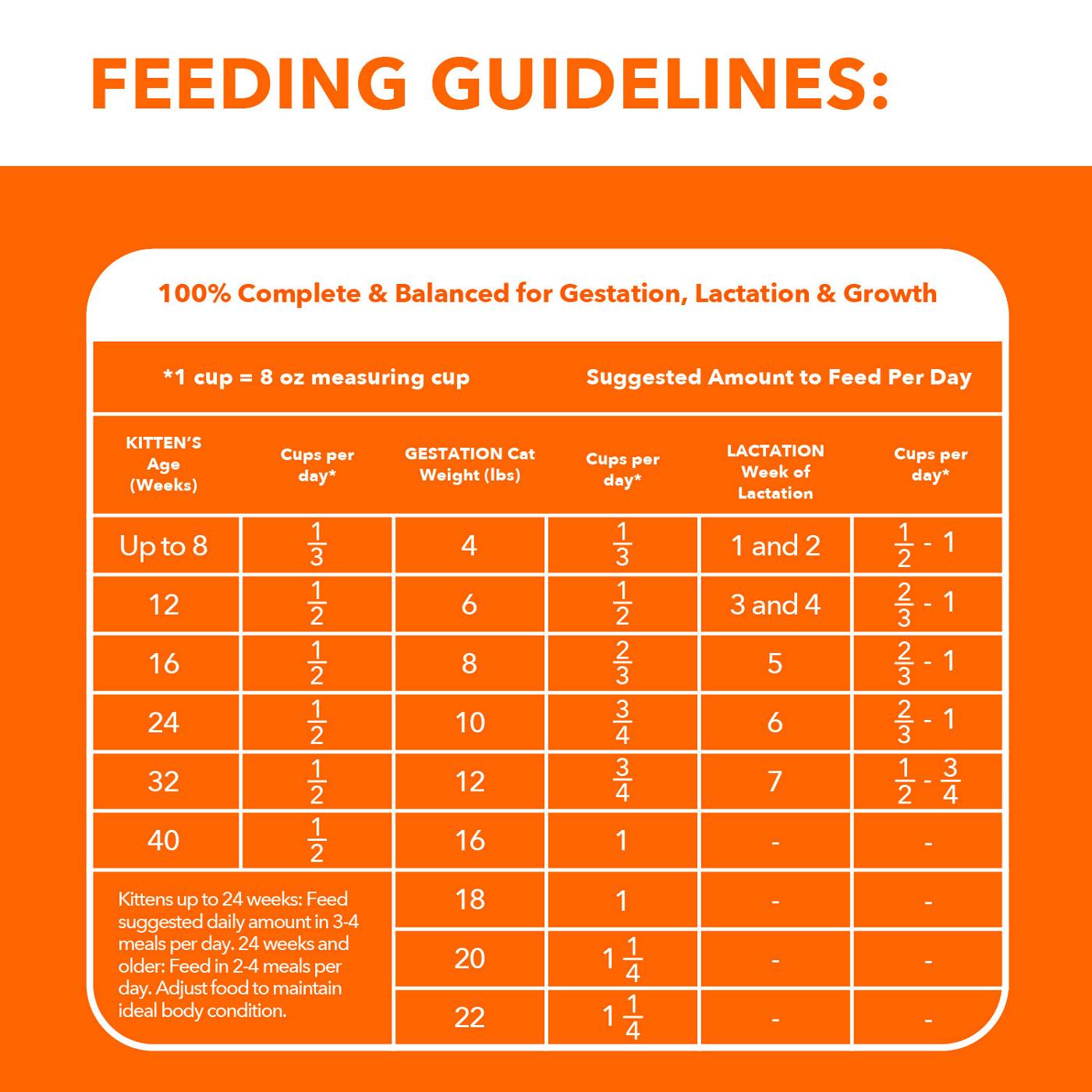 Guaranteed Analysis Nutrients: Crude Protein min 33.0 %; Crude Fat min 21.0 %; Crude Fiber max 3.0 %; Moisture max 10.0 %; Calcium min 1.2 %; Phosphorus min 0.8 %; Docosahexaenoic acid (DHA) min 0.05 %; Vitamin E min 140 IU/kg; Taurine min 0.15 %; Omega-6 Fatty Acids min 3.0 %; Omega-3 Fatty Acids min 0.30 %. Not recognized as an essential nutrient by the AAFCO Cat Food Nutrient Profiles..