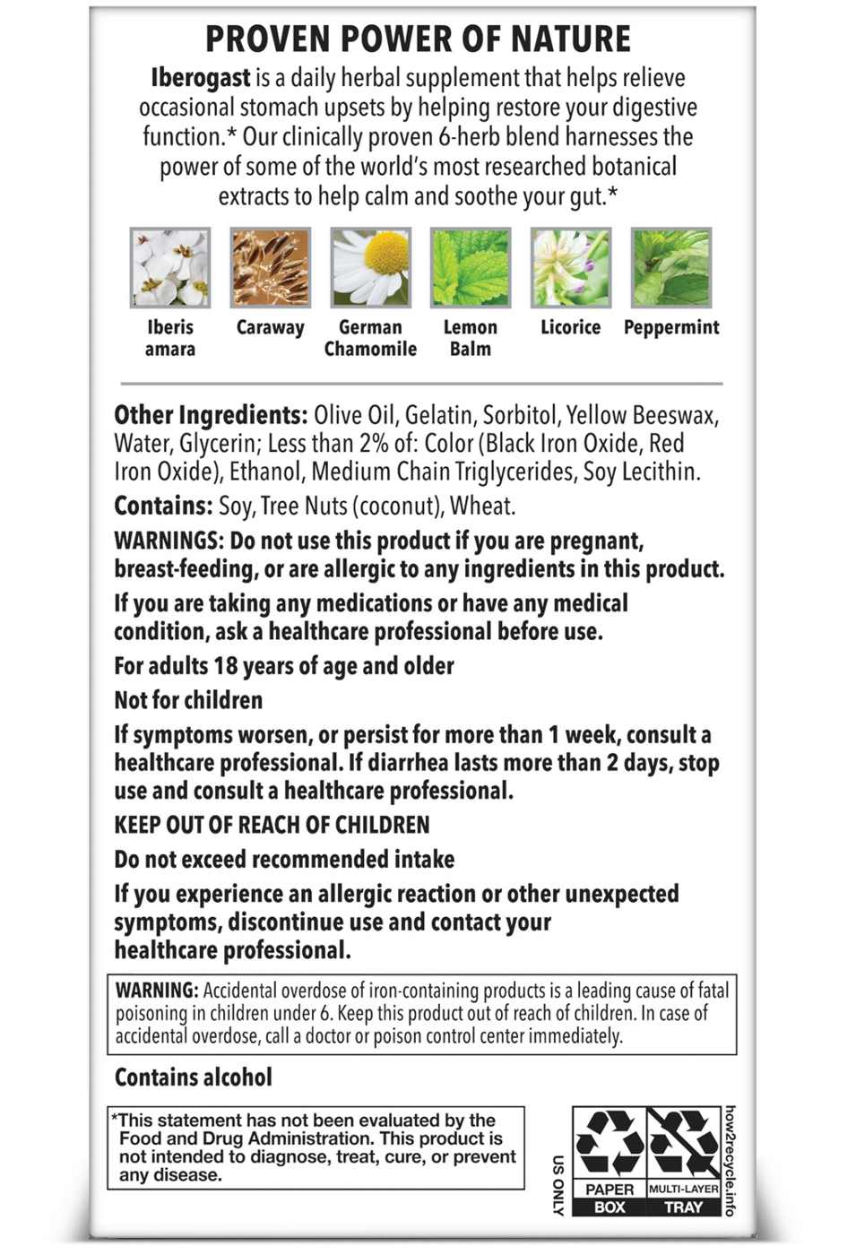 Iberogast Softgel is a daily herbal supplement that helps relieve occasional stomach upsets by helping restore digestive function with the power of our proprietary 6-herb blend.* We believe the power of nature is best when proven by science. Iberogast is proven effective in 4 clinical studies. Our proprietary 6-herb blend harnesses the power of some of the world’s most researched botanical extracts to help calm and soothe your gut.* Iberogast is not another probiotic or digestive enzyme. It is a unique way to provide digestive relief to support gut health.* It can help your gut work like normal in 5 ways by helping to: 1) reduce stomach acid; 2) regulate stomach muscles; 3) calm gut nerves; 4) support gut lining and 5) support gut microbiome.†* Peppermint helps relieve occasional bloating.* German Chamomile helps reduce stomach acidity and regulate some stomach muscles.* Licorice helps support gut lining and reduce acidity in the stomach.* Lemon Balm helps regulate gut muscles.* Caraway helps relieve occasional indigestion in combination with Peppermint.* Try Iberogast if you are looking for digestive relief from occasional stomach upsets, including indigestion, nausea, fullness, bloating, heartburn, gas, abdominal discomfort + constipation/diarrhea.*