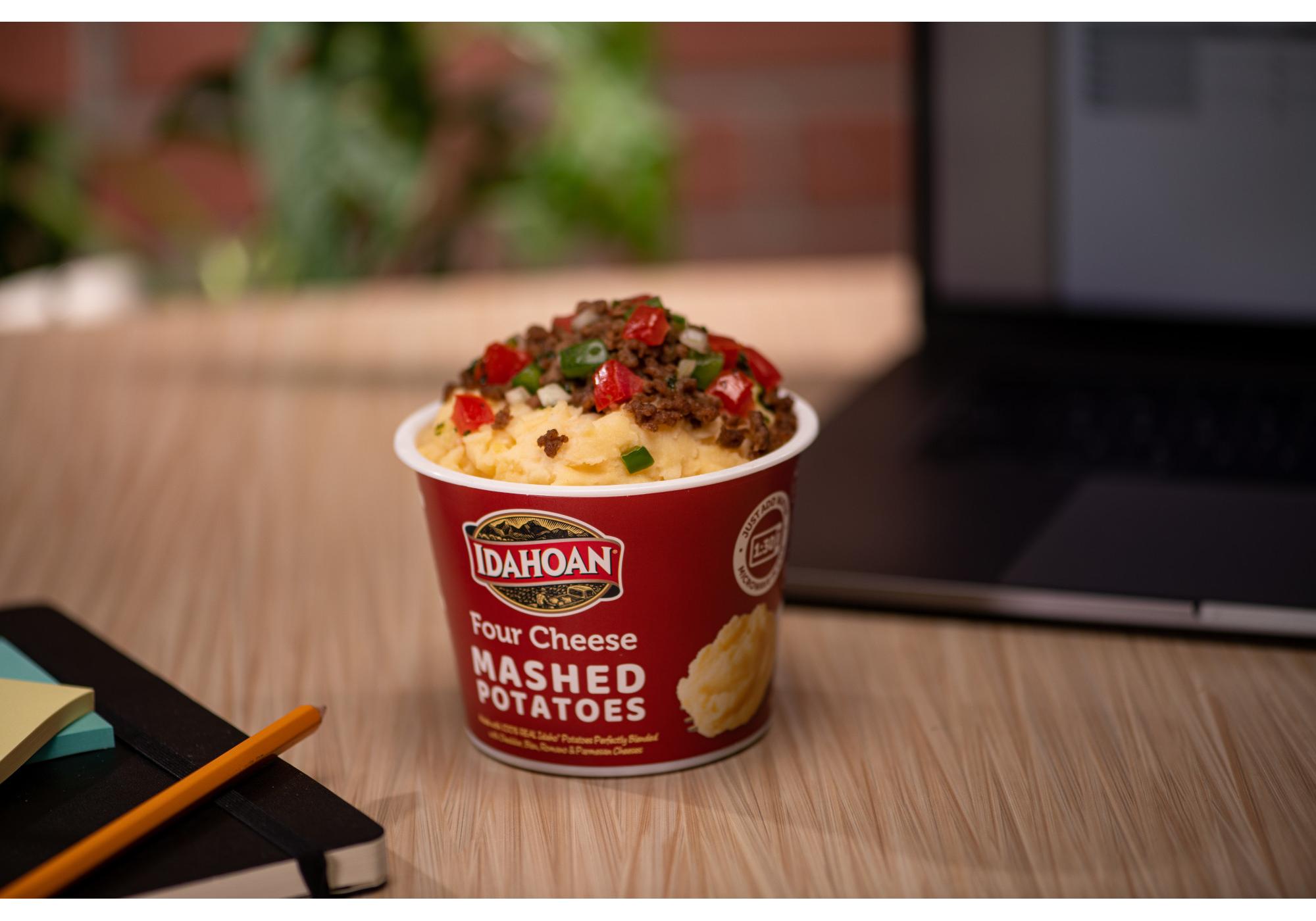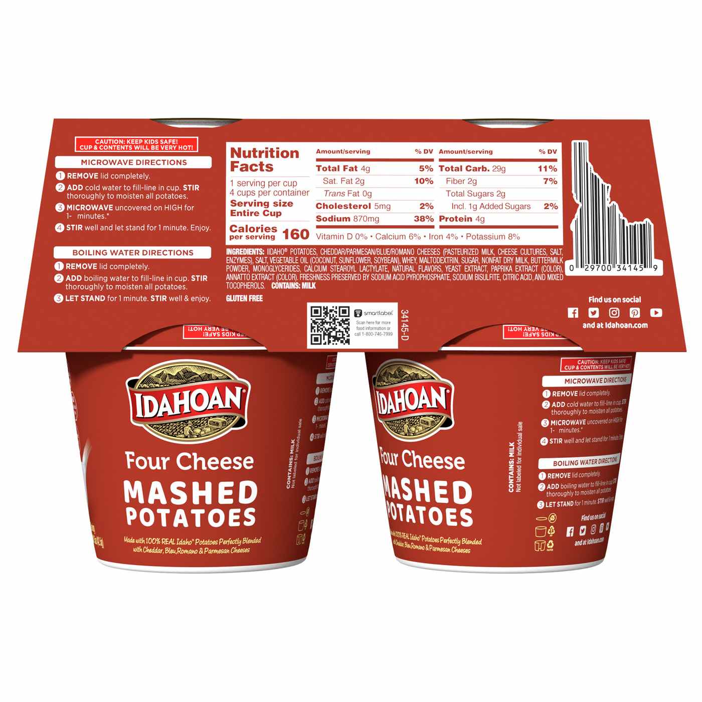 Whip up delicious, rich mashed potatoes in minutes with Idahoan® Four Cheese Mashed Potatoes! We’re sure you’ll find many great uses for Idahoan’s Four Cheese Mashed Potatoes Cup, from snacks to work-time lunch sides. The flavor of Idahoan’s best, now in an ultra-convenient pack. Our instant mashed potatoes are always made with 100% real Idaho® potatoes make for a classic favorite. Perfect for a variety of wholesome recipes, Idahoan Four Cheese Mashed Potatoes are easy to prepare and ready in minutes. Simply add cold water to fill-line in cup, stir, microwave for 1 1/2 minutes, and voilà! Each order includes 4 (1.5oz) cups. Whether you’re looking for traditional comfort food, or wanting a modern spin on classic dishes, Idahoan delivers Homemade Taste—Every Time.