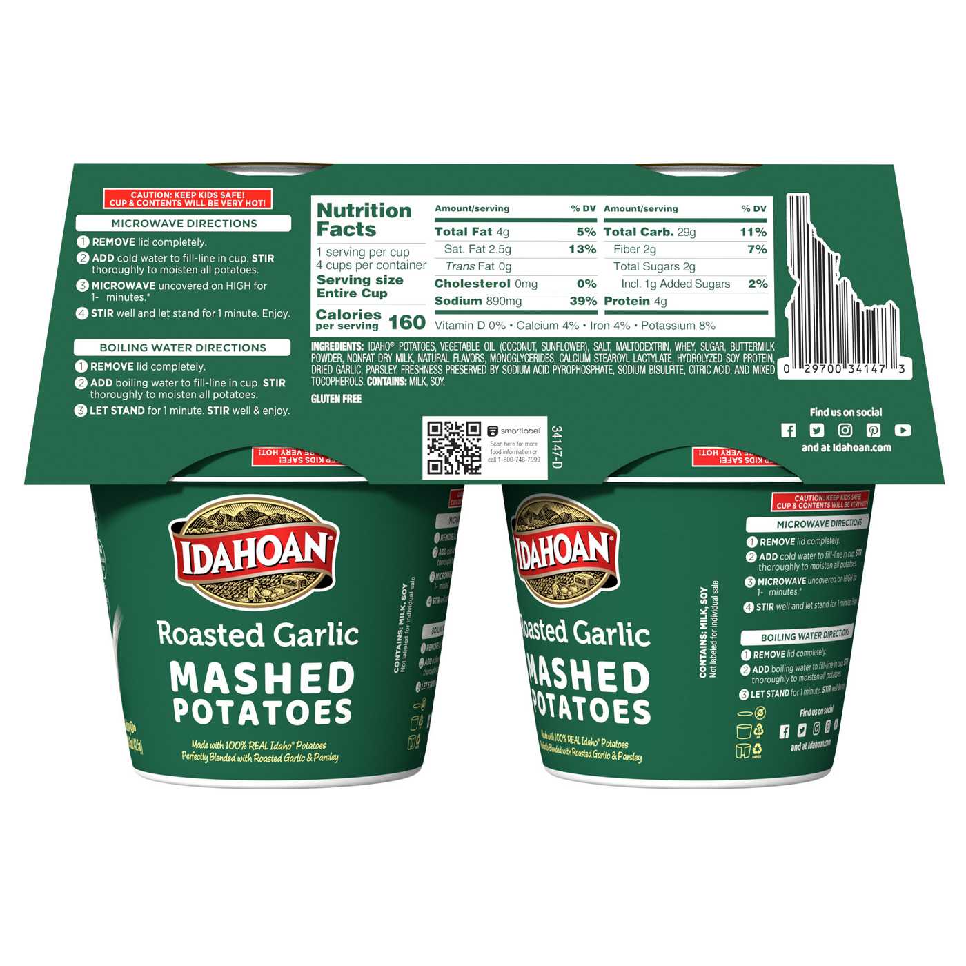 Whip up delicious, rich mashed potatoes in minutes with Idahoan® Roasted Garlic Mashed Potatoes! We’re sure you’ll find many great uses for Idahoan’s Roasted Garlic Mashed Potatoes Cup, from snacks to work-time lunch sides. The flavor of Idahoan’s best, now in an ultra-convenient pack. Our instant mashed potatoes are always made with 100% real Idaho® potatoes make for a classic favorite. Perfect for a variety of wholesome recipes, Idahoan Roasted Garlic Mashed Potatoes are easy to prepare and ready in minutes. Simply add cold water to fill-line in cup, stir, microwave for 1 1/2 minutes, and voilà! Each order includes 4 (1.5oz) cups. Whether you’re looking for traditional comfort food, or wanting a modern spin on classic dishes, Idahoan delivers Homemade Taste—Every Time.