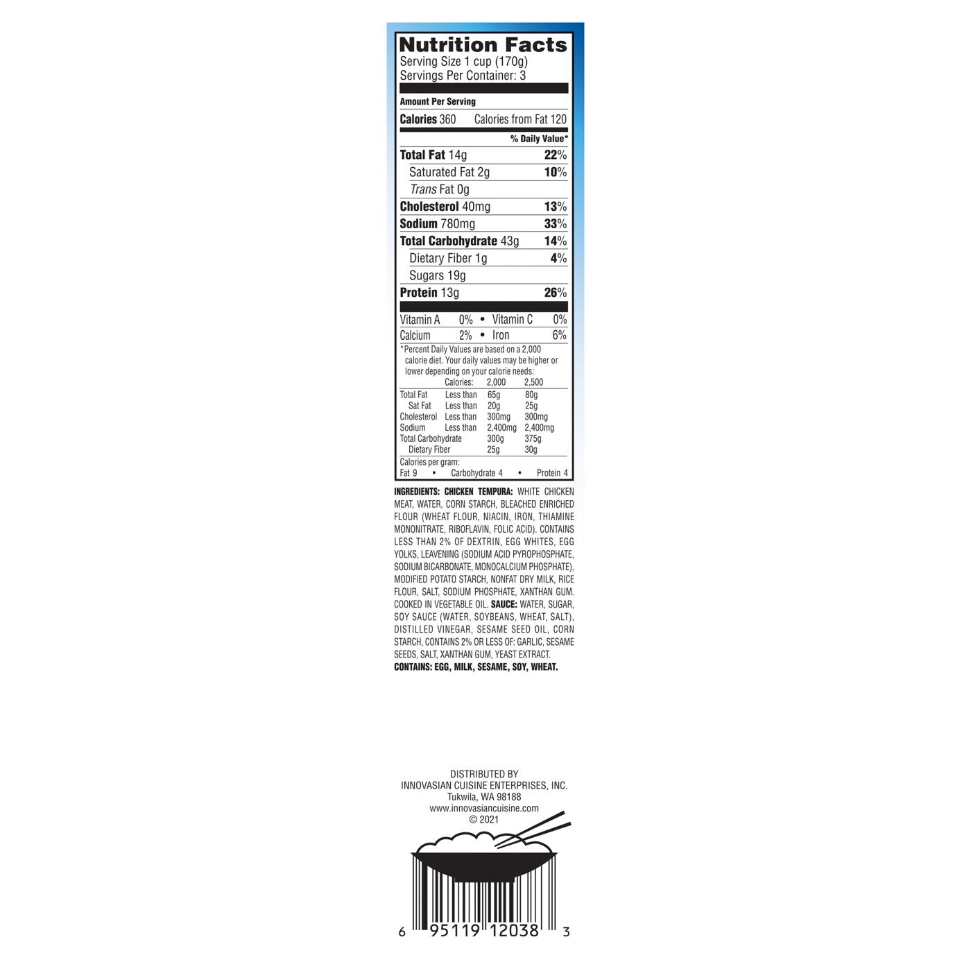 Chicken Tempura: White Chicken Meat, Water, Corn Starch, Bleached Enriched Flour (Wheat Flour, Niacin, Iron, Thiamine Mononitrate, Riboflavin, Folic Acid), Contains Less than 2% of Dextrin, Egg Whites, Egg Yolks, Leavening (Sodium Acid Pyrophosphate, Sodium Bicarbonate, Monocalcium Phosphate), Modified Potato Starch, Nonfat Dry Milk, Rice Flour, Salt, Sodium Phosphate, Xanthan Gum, Cooked in Vegetable Oil, Sauce: Water, Sugar, Soy Sauce (Water, Soybeans, Wheat, Salt), Distilled Vinegar, Sesame Seed Oil, Corn Starch, Contains 2% or Less of: Garlic, Sesame Seeds, Salt, Xanthan Gum, Yeast Extract.Allergens and safety warnings