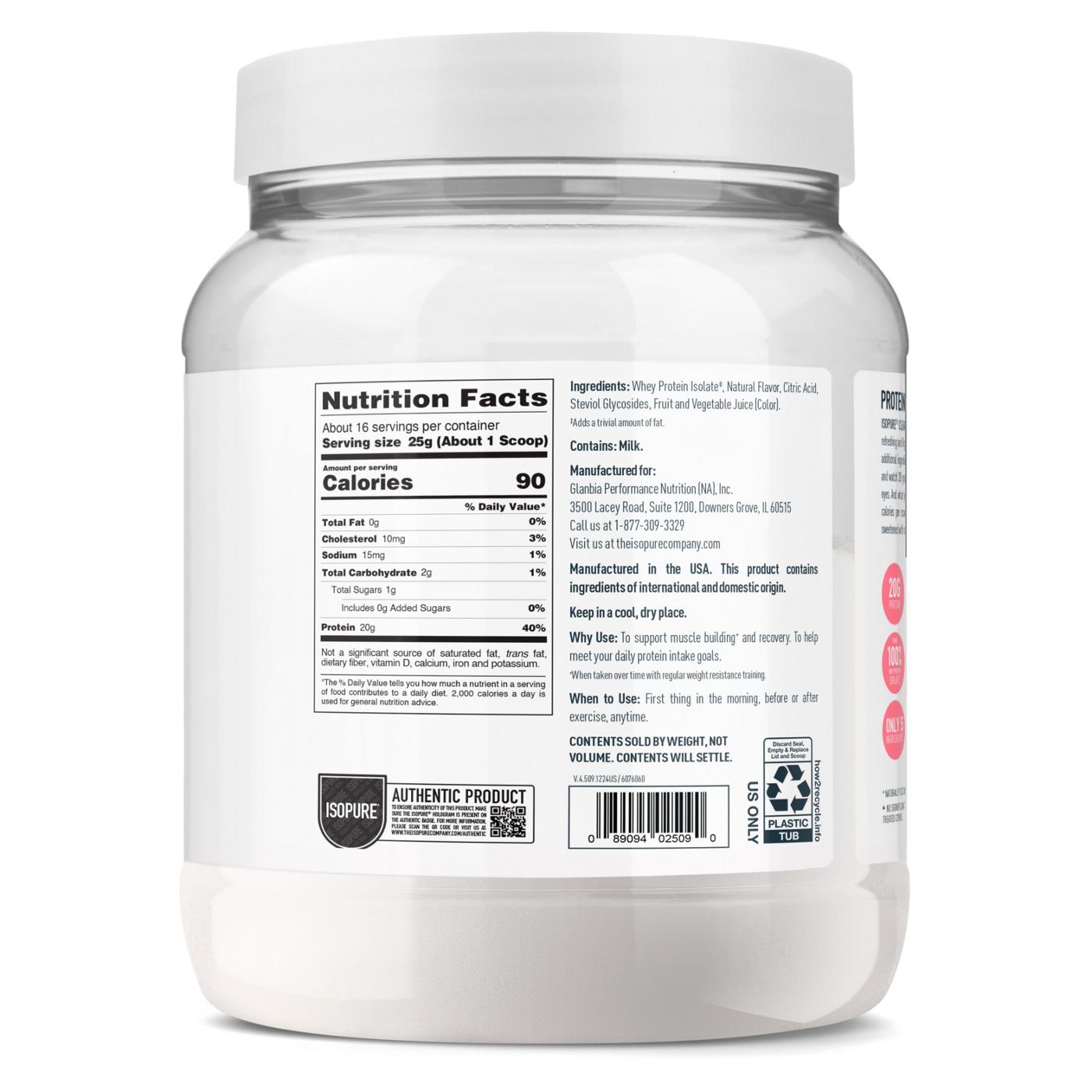 Taste the difference of protein purity from Isopure. This protein powder is not your typical milkshake-like powder. It's a refreshing and lightly fruit-flavored experience that delivers the protein you want without all the additional ingredients you don't. What you see is what you get: 5 ingredients, 0 grams fat, no added sugars and 90 calories per scoop. Simple, mighty and delicious.