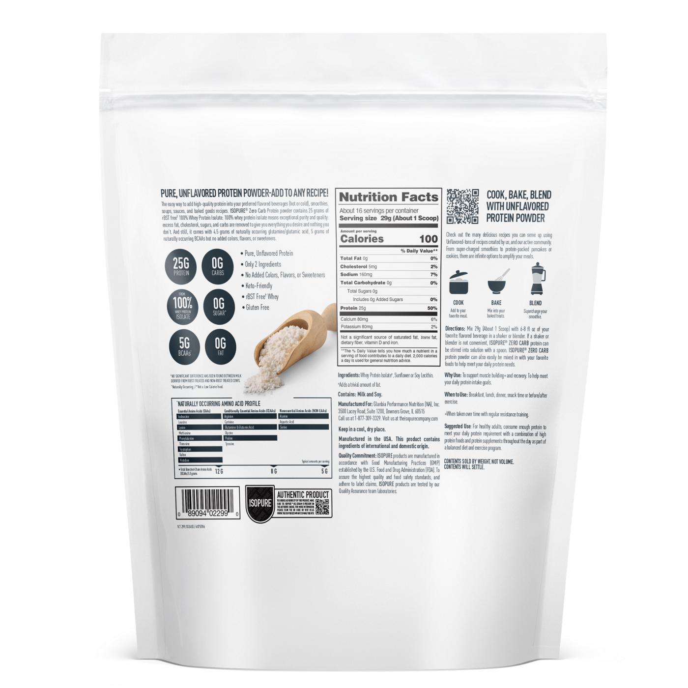 Add pure unflavored protein powder to any recipe. Isopure Zero Carb unflavored protein powder contains 25 grams of 100% whey protein isolate. Excess fat, cholesterol, sugars and carbs have been removed to give you everything you desire and nothing you don't. Keto-friendly and gluten-free, it's helpful for muscle-building support and meeting your daily protein intake goals.
