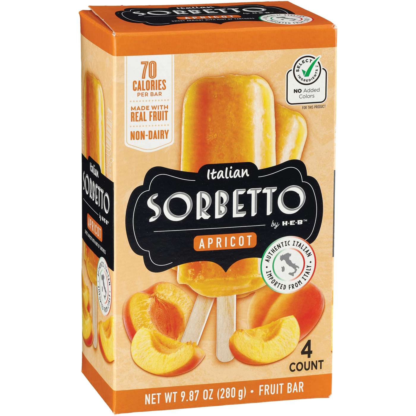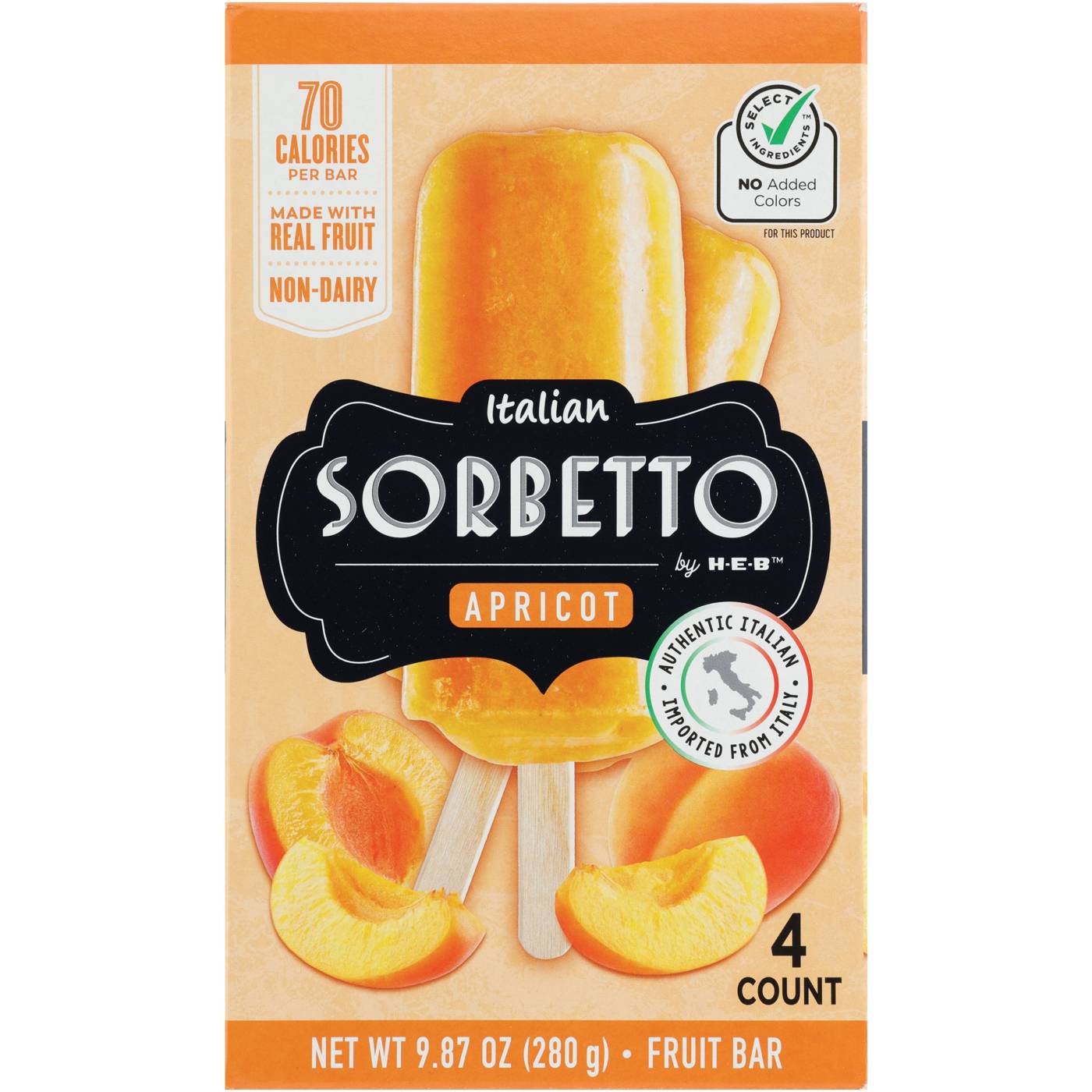 For flavor-packed frozen fruit bars, pick up a 4-pack of Italian Sorbetto by H-E-B. Our Apricot variety is non-dairy and made with real fruit in the Lombardy region of Northern Italy. The texture and taste is similar to what you’d imagine enjoying in an Italian gelateria, only right here at home!