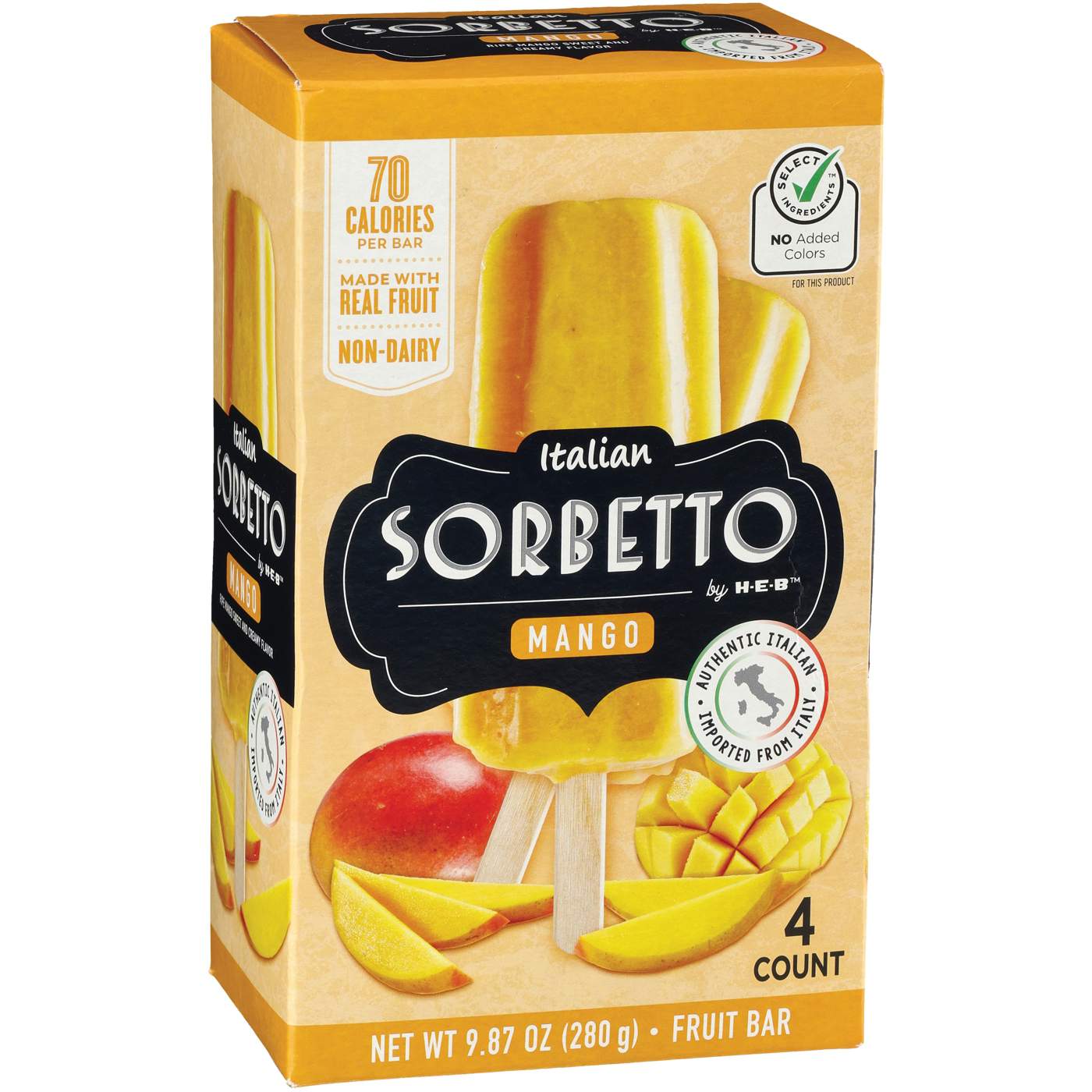 Treat everyone to the flavor-packed coolness of Italian Sorbetto by H-E-B. These frozen fruit bars are non-dairy and made with real mangos in the Lombardy region of Northern Italy. The texture and taste is similar to what you’d imagine enjoying in an Italian gelateria, only right here at home!