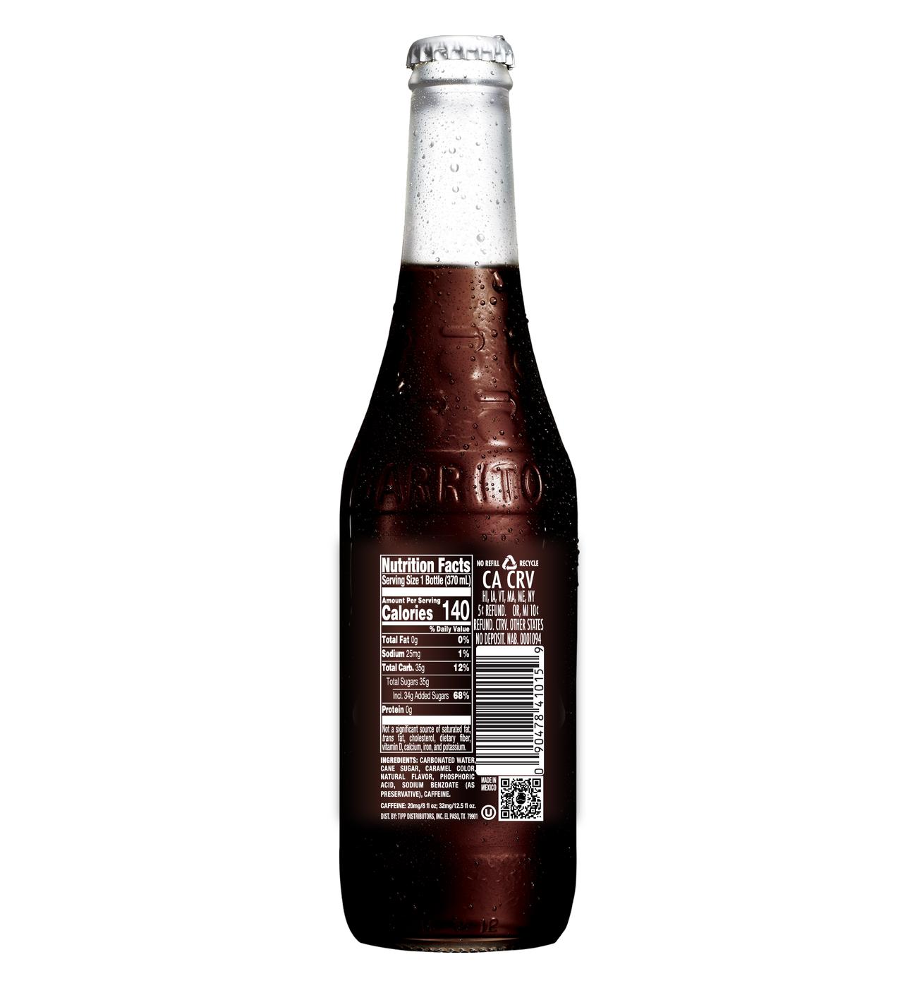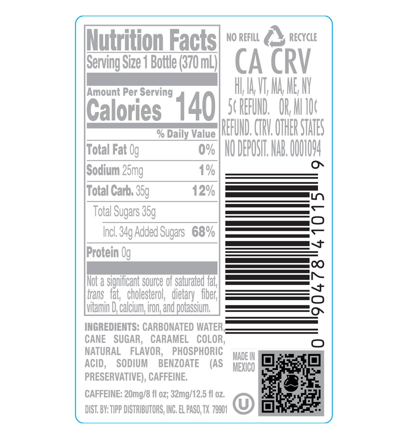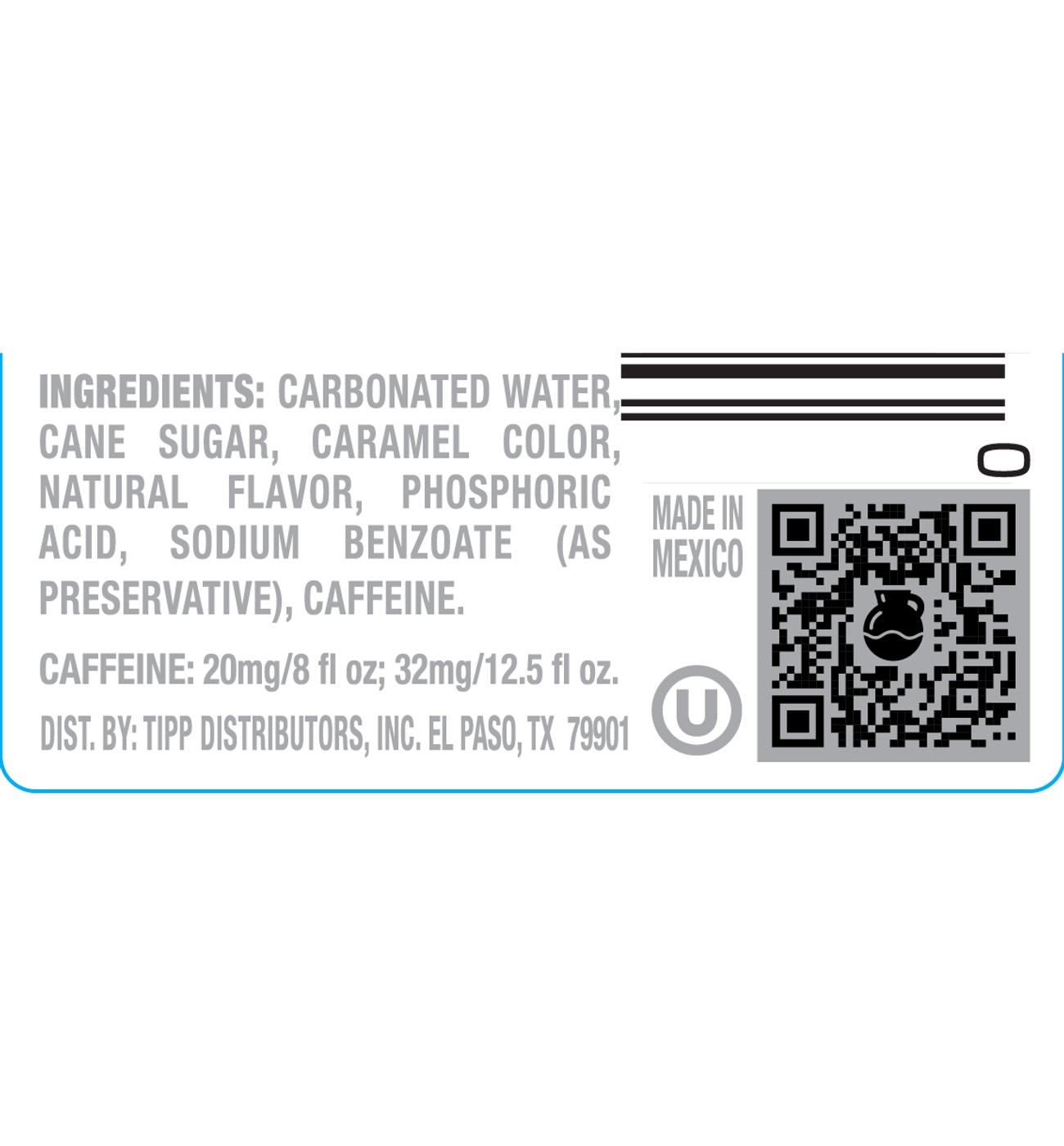 Natural flavor soda with real sugar. Caffeine Content: 20 mg / 8 fl oz; 32 mg / 12.5 fl oz. Cola with a twist. No refill. Recycle. Made in Mexico.