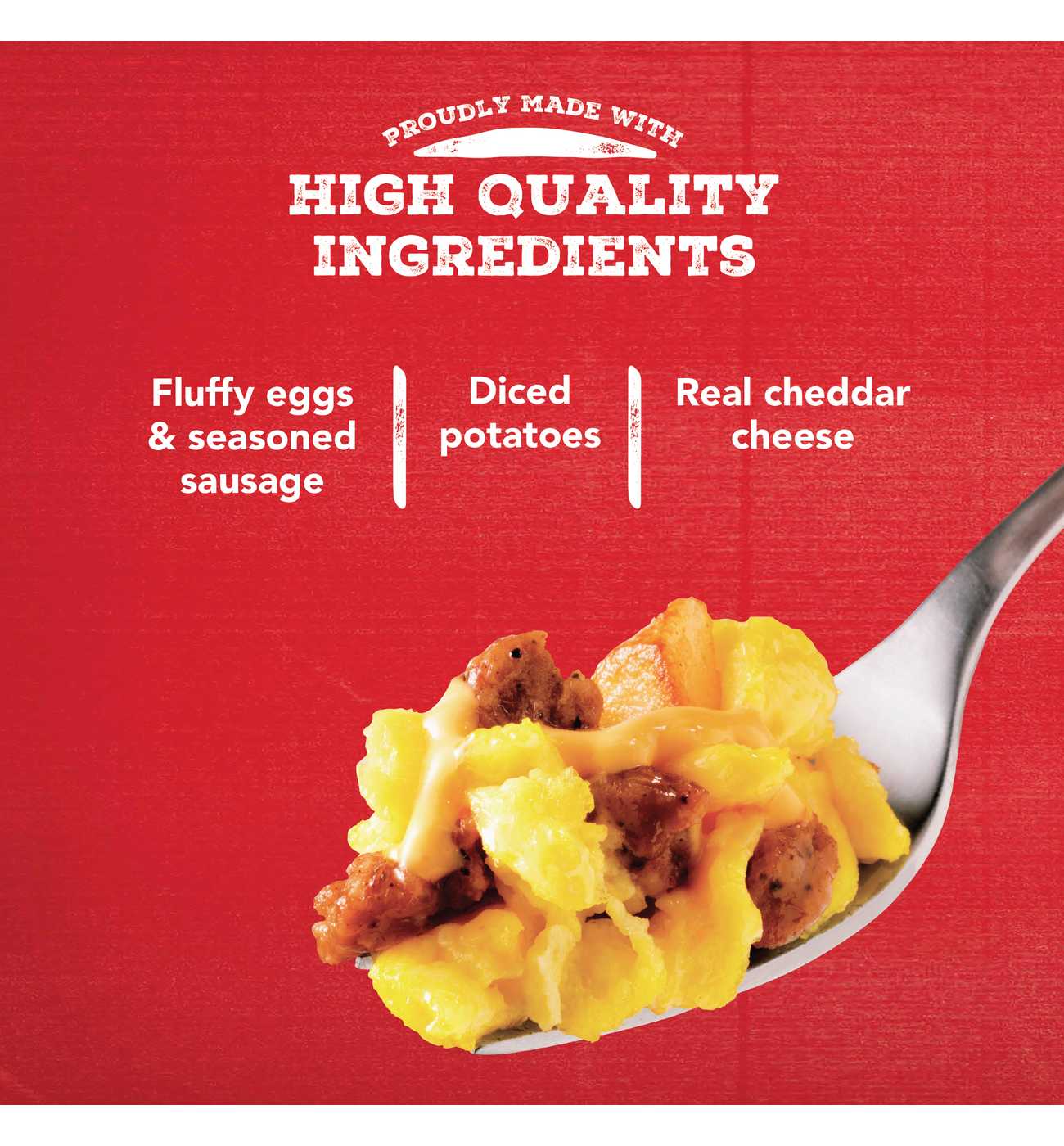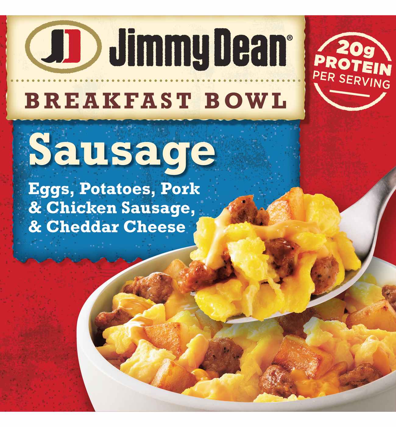 Filled with sausage crumbles, eggs, potatoes, and cheddar cheese, Jimmy Dean Sausage, Egg & Cheese Breakfast Bowls are sure to be the best part of your morning. Each microwavable bowl has 19 grams of protein per serving. Simple to prepare as a microwavable breakfast and ready in minutes, our frozen breakfast bowl is made with premium ingredients and the Jimmy Dean brand quality you know and trust.- One Jimmy Dean Sausage, Egg & Cheese Breakfast Bowl- Each quick breakfast has 19 grams of protein per serving- Sausage crumbles, fluffy eggs, homestyle potatoes, and real cheddar cheese- Microwavable bowl is ready in minutes and easy to prepare- Simply microwave and serve for a delicious breakfast- Convenient, single serve bowl