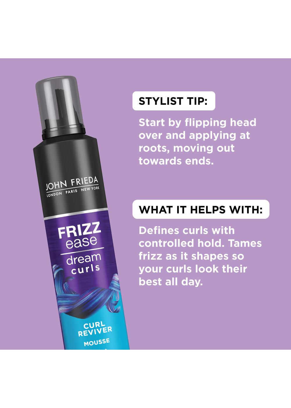 Bring the bounce back to your curls. John Frieda Frizz Ease Curl Reviver Mousse creates soft, defined, natural-looking definition, for shiny and frizz-free curls or ringlets. Formulated for curly and frizzy hair, our Curl Reviver Mousse will lock in moisture while enhancing curls and taming your frizz. An alcohol-free formula won't weigh hair down or dry it out. A small amount worked into damp hair yields healthy-looking, springy, glossy curls. Works best when used on damp hair that’s air dried or blow dried with a diffuser.