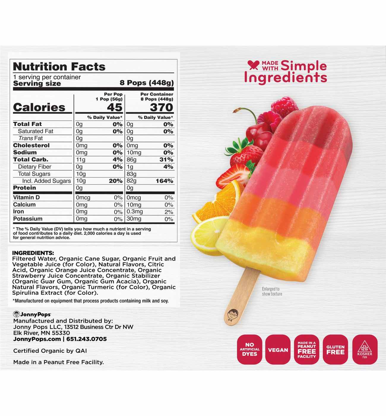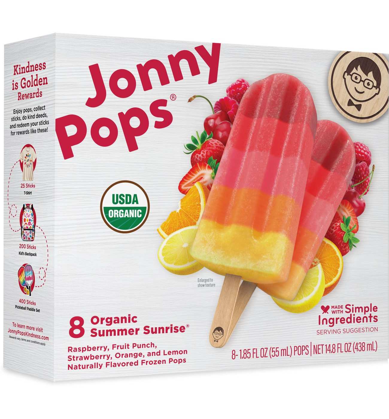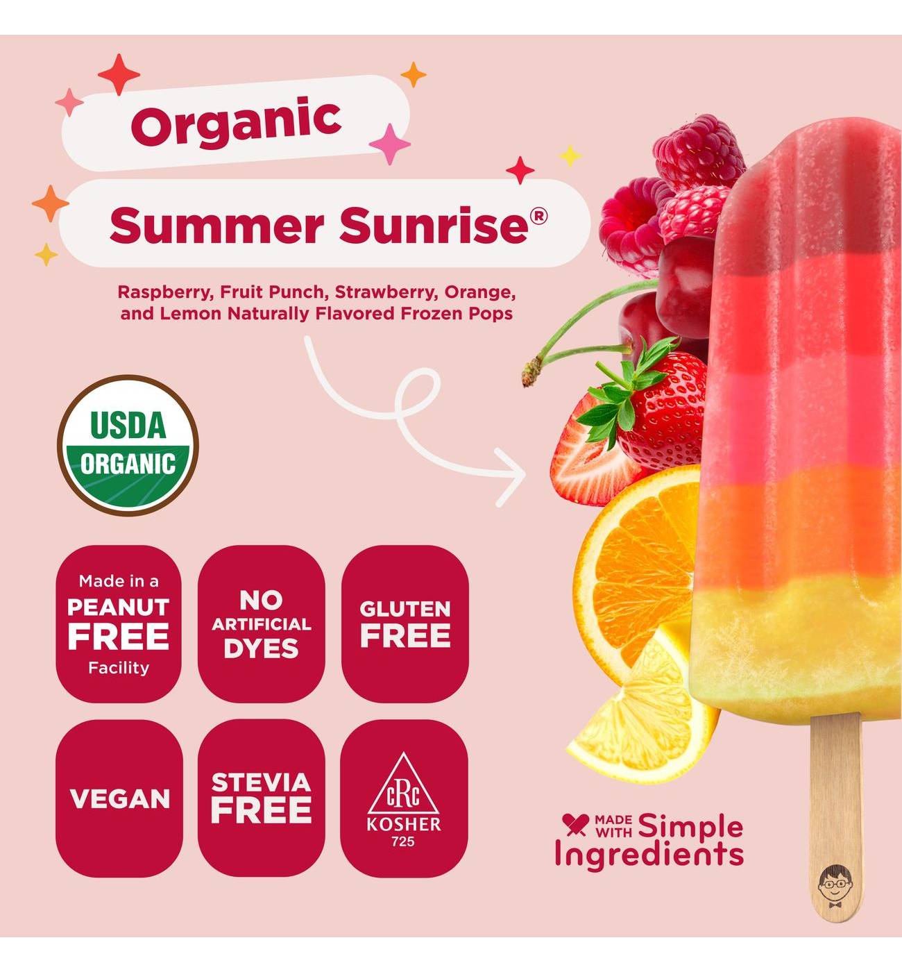 Like the colors of a beautiful sunrise, the flavors of raspberry, fruit punch, strawberry, orange, and lemon are layered to make each taste of Organic Summer Sunrise Naturally Flavored Frozen Pops memorable. Made with simple ingredients and no artificial dyes, these pops are vegan, gluten-free, and made in a peanut free facility - a treat you can feel great about sharing! In honor of our namesake, Jonathan, there's a kind deed on every stick. We believe sharing kindness through actions big and small makes the world a better place. A Better Pop for a Better World!®
