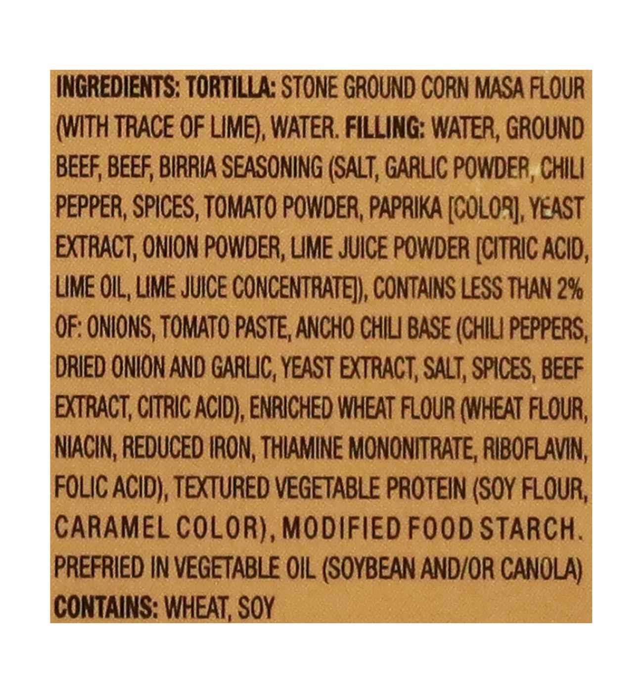 Tortilla: Stone Ground Corn Masa Flour (with Trace of Lime), Water, Filling: Water, Ground Beef, Beef, Birria Seasoning (Salt, Garlic Powder, Chili Pepper, Spices, Tomato Powder, Paprika [Color], Yeast Extract, Onion Powder, Lime Juice Powder [Citric Acid, Lime Oil, Lime Juice Concentrate]), Contains Less than 2% of: Onions, Tomato Paste, Ancho Chili Base (Chili Peppers, Dried Onion and Garlic, Yeast Extract, Salt, Spices, Beef Extract, Citric Acid), Enriched Wheat Flour (Wheat Flour, Niacin, Reduced Iron, Thiamine Mononitrate, Riboflavin, Folic Acid), Textured Vegetable Protein (Soy Flour, Caramel Color), Modified Food Starch, Prefried in Vegetable Oil (Soybean and/or Canola).