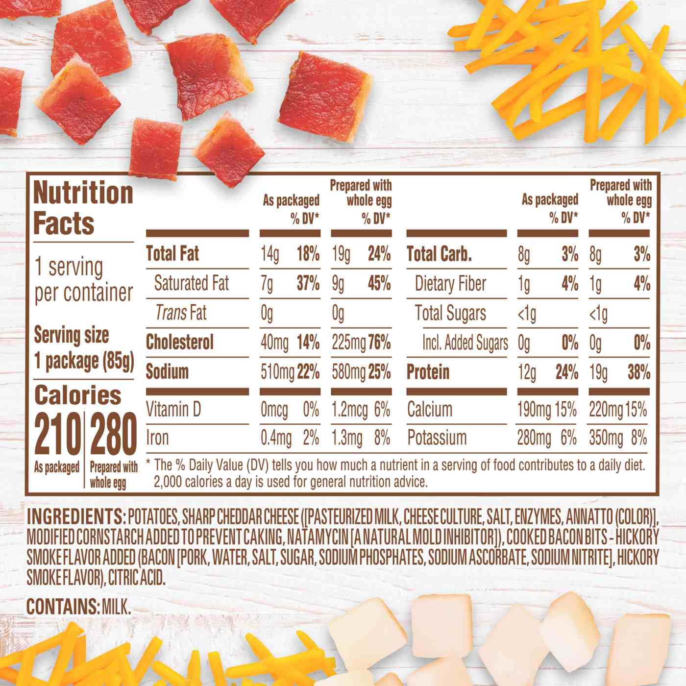 Potatoes, Cheddar Cheese ([Pasteurized Milk, Cheese Culture, Salt, Enzymes, Annatto (Color)], Modified Cornstarch Added to Prevent Caking, Natamycin [a Natural Mold Inhibitor], Cooked Uncured Bacon Bits - No Nitrates or Nitrites Added Except Those Naturally Occurring in Celery Juice and Sea Salt (Pork, Water, Sea Salt, Sugar, Cultured Celery Juice, Cherry Powder), Citric Acid.Allergens and safety warnings