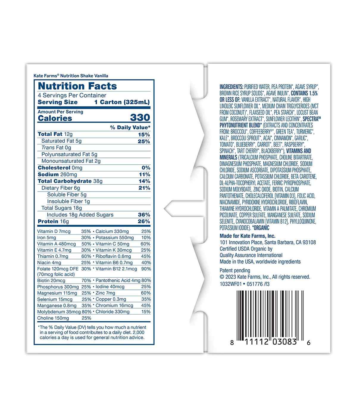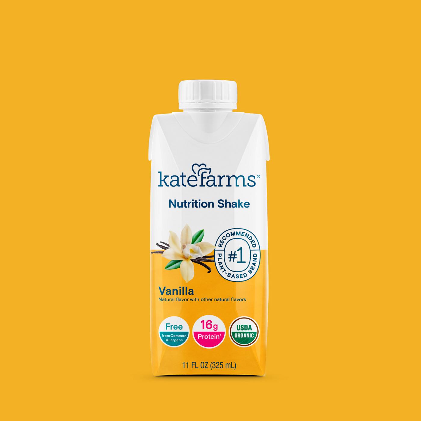 Kate Farms Nutrition Shake is a delicious, organic, plant-based shake designed to help support your nutrition goals. Nutrition Shake contains a unique blend of plant-based protein, prebiotic fiber, and carbohydrates to provide you with balanced nutrition. Each carton provides 330 calories, 27 vitamins and minerals*, and 16 grams of protein from organic pea*.