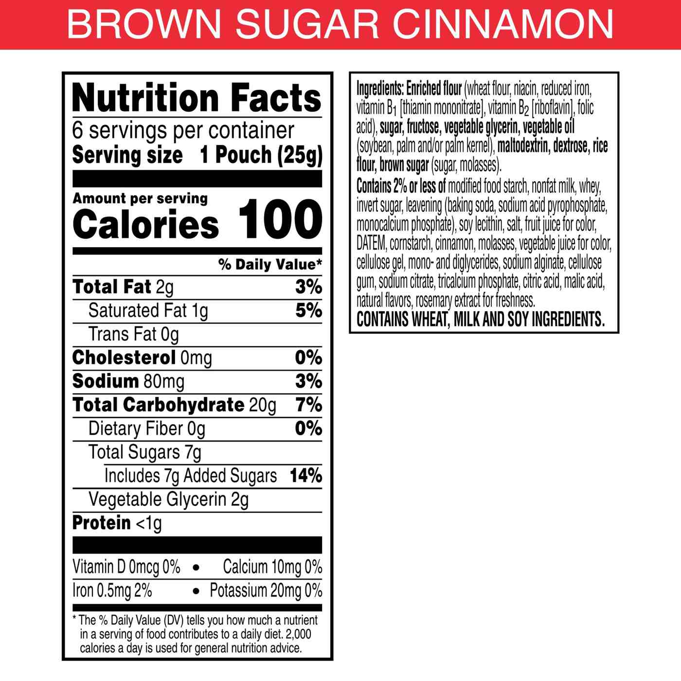 Enriched Flour (Wheat Flour, Niacin, Reduced Iron, Vitamin B1 [Thiamin Mononitrate], Vitamin B2 [Riboflavin], Folic Acid), Sugar, Fructose, Vegetable Glycerin, Vegetable Oil (Soybean, Palm and/or Palm Kernel), Maltodextrin, Dextrose, Rice Flour, Brown Sugar (Sugar, Molasses). Contains 2% or Less of Modified Food Starch, Nonfat Milk, Whey, Invert Sugar, Leavening (Baking Soda, Sodium Acid Pyrophosphate, Monocalcium Phosphate), Soy Lecithin, Salt, Fruit Juice for Color, DATEM, Cornstarch, Cinnamon, Molasses, Vegetable Juice for Color, Cellulose Gel, Mono- and Diglycerides, Sodium Alginate, Cellulose Gum, Sodium Citrate, Tricalcium Phosphate, Citric Acid, Malic Acid, Natural Flavors, Rosemary Extract for Freshness.Allergens and safety warnings