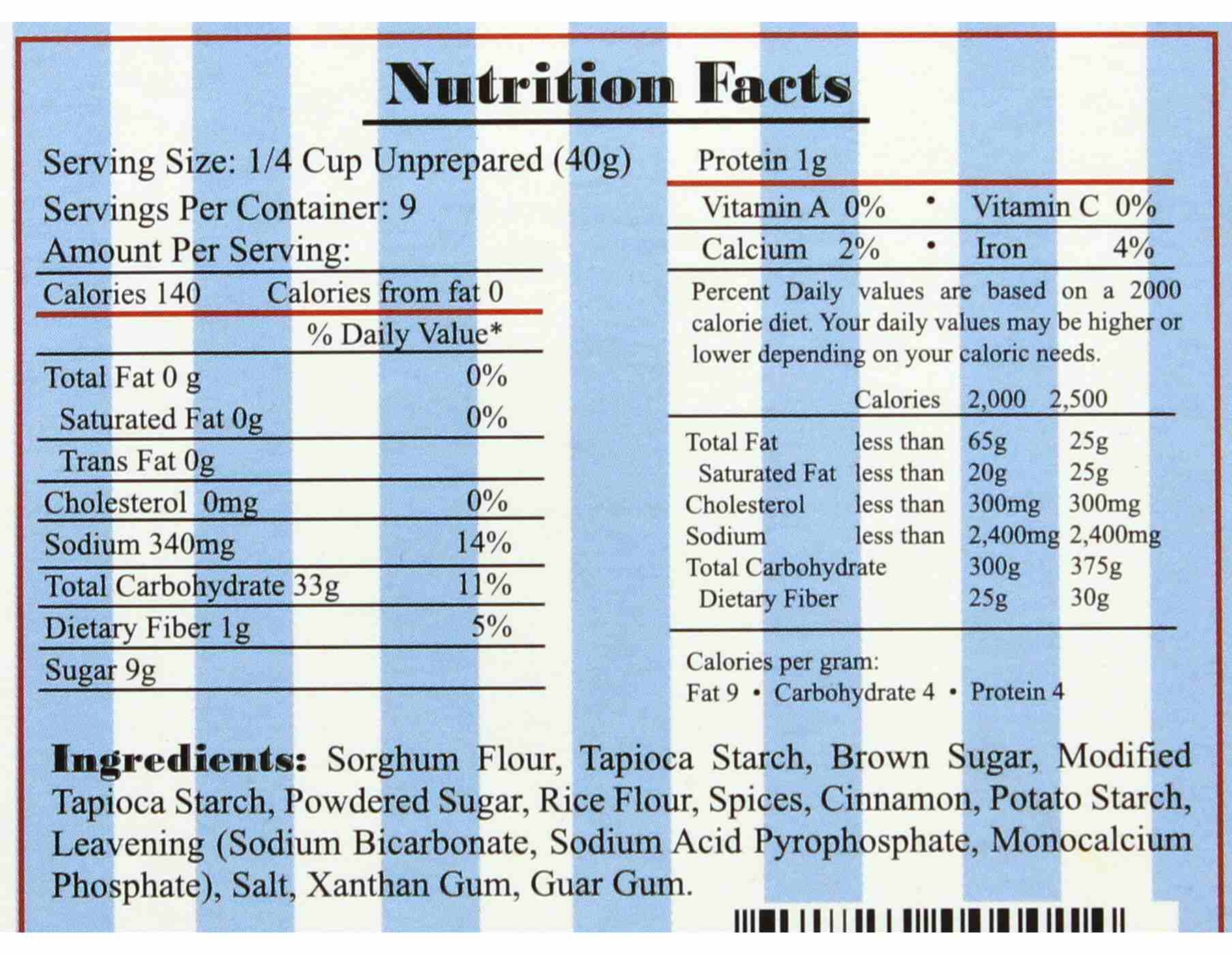 Sorghum Flour, Tapioca Starch, Brown Sugar, Modified Tapioca Starch, Powdered Sugar, Rice Flour, Spices, Cinnamon, Potato Starch, Leavening (Sodium Bicarbonate, Sodium Acid Pyrophosphate, Corn Starch, Mono Calcium Phosphate), Canola Oil, Salt, Xanthan Gum, Guar Gum.
