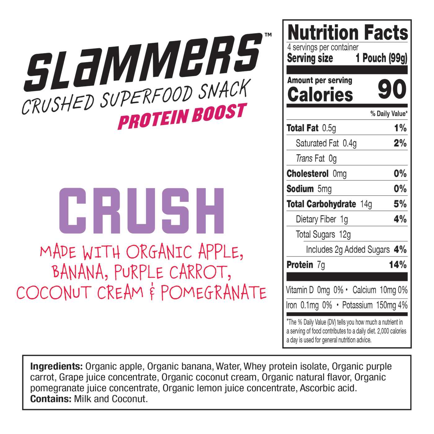 Organic Apple, Organic Banana, Water, Whey Protein Isolate, Coconut Cream, Grape Juice Concentrate, Organic Pomegranate Juice Concentrate, Purple Carrot Juice Concentrate, Organic Lemon Juice Concentrate, Ascorbic Acid.Allergens and safety warnings