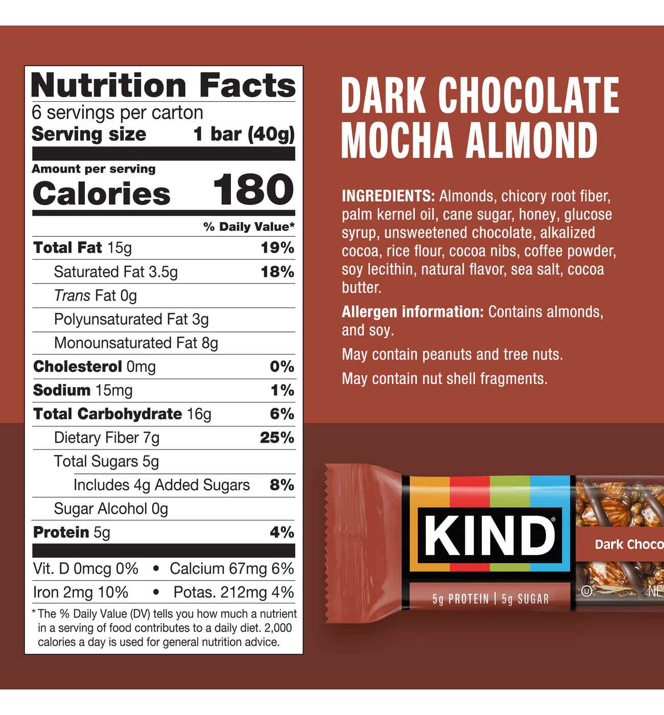 We agree coffee is too good to be limited to one cup of joe in the AM. Savor the taste of dark chocolate mocha all day with this buzz worthy almond-packed snack with 5g of sugar per bar.