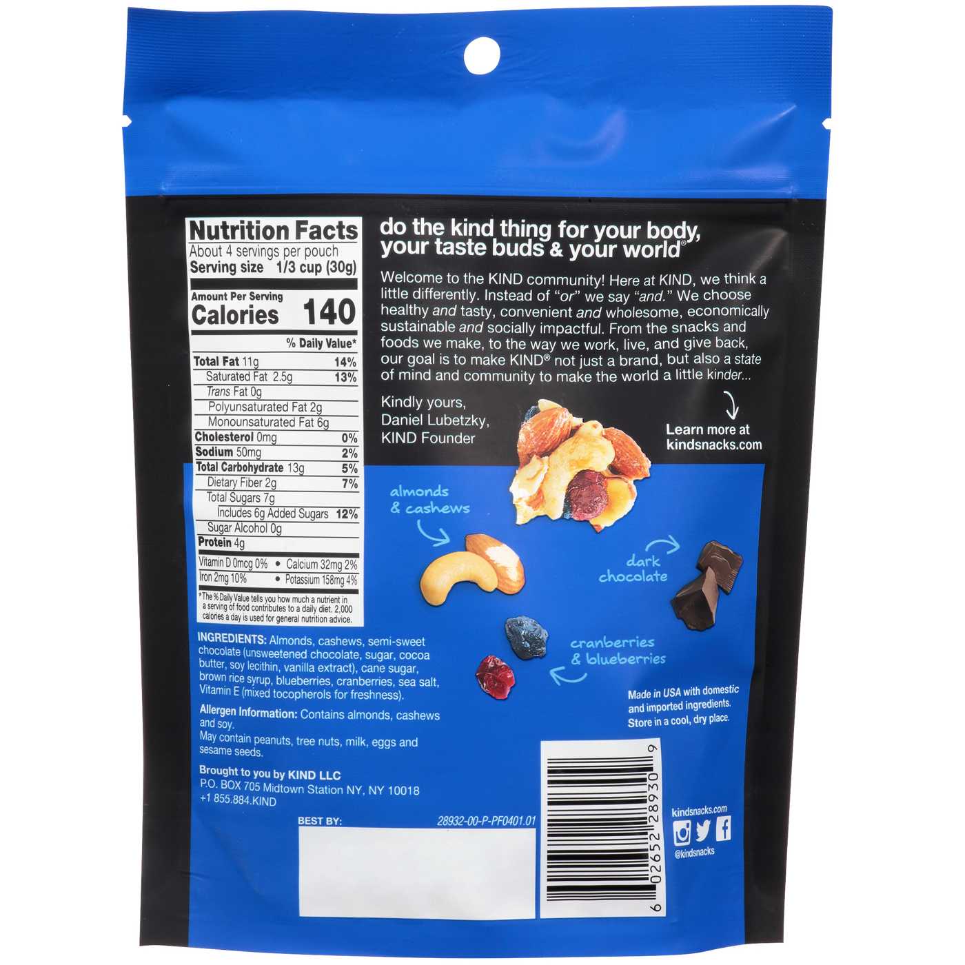 Almonds, Cashews, Semi-Sweet Chocolate (Unsweetened Chocolate, Sugar, Cocoa Butter, Soy Lecithin, Vanilla Extract), Cane Sugar, Brown Rice Syrup, Blueberries, Cranberries, Sea Salt, Vitamin E (Mixed Tocopherols for Freshness).Allergens and safety warnings