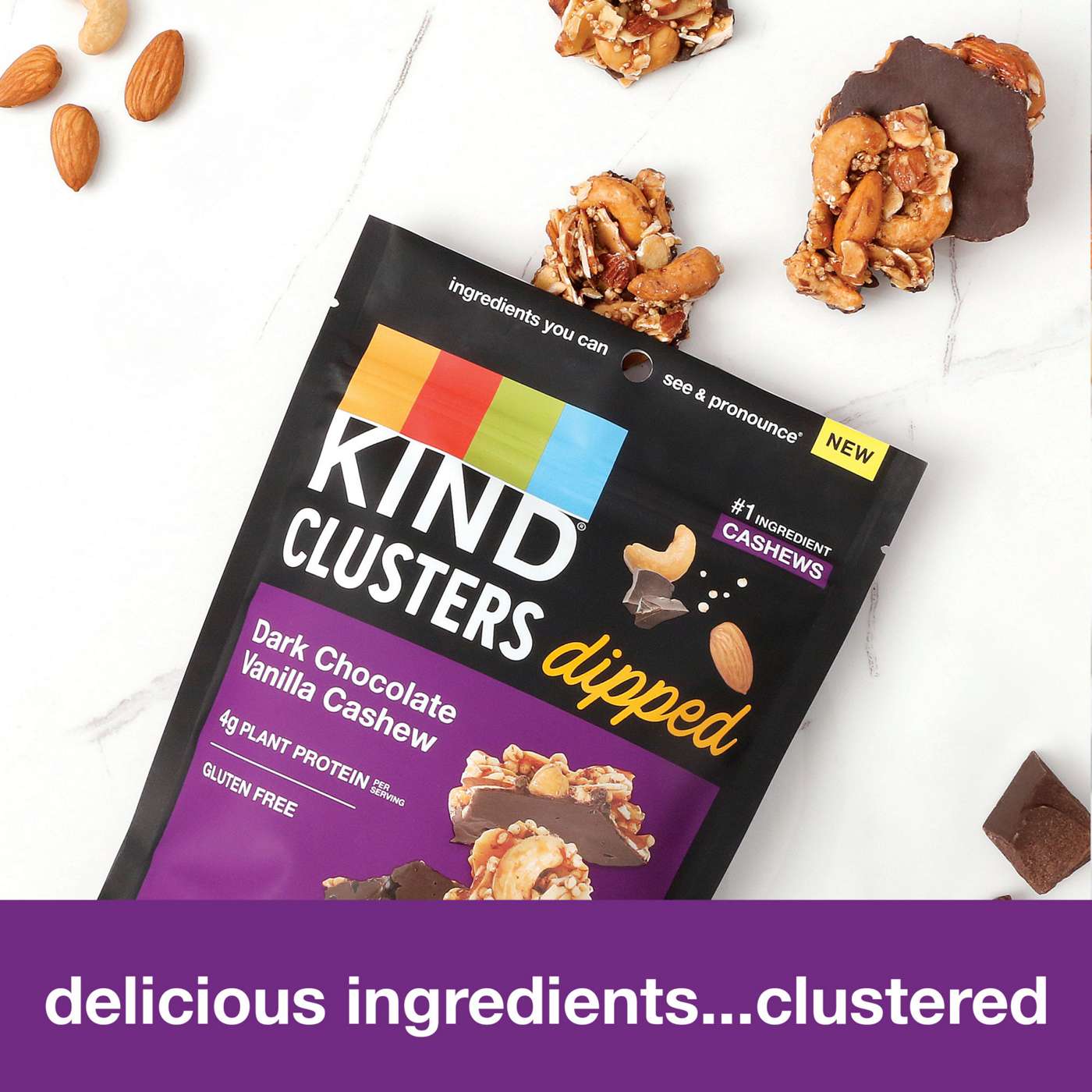 KIND Dark Chocolate Vanilla Cashew Dipped Clusters are decadent, all-in-one, convenient, hand-to-mouth gluten free snacks or healthy treats. These crunchy nut clusters are made with cashews as the #1 ingredient and combine cashews, almonds and vanilla into snackable bites that are dipped in rich, dark chocolate. KIND Dipped Clusters deliver incredible flavor for an uncompromisingly delicious, nutrient-dense, guilt-free snack mix for dessert or any time of day. Sprinkle KIND Dipped Clusters over yogurt for a delectable afternoon snack, or grab a few of these low sodium snacks after dinner for a healthy chocolate covered treat that you can enjoy as dessert. These chocolate dipped clusters contain 4 grams of plant protein per serving.