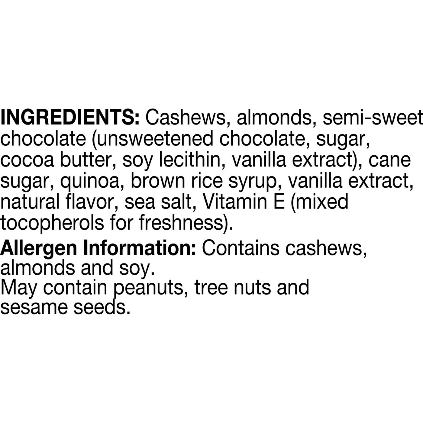 CASHEWS, ALMONDS, SEMI-SWEET CHOCOLATE (UNSWEETENED CHOCOLATE, SUGAR, COCOA BUTTER, SOY LECITHIN, VANILLA EXTRACT), CANE SUGAR, QUINOA, BROWN RICE SYRUP, VANILLA EXTRACT, NATURAL FLAVOR, SEA SALT, VITAMIN E (MIXED TOCOPHEROLS FOR FRESHNESS).Allergens and safety warnings