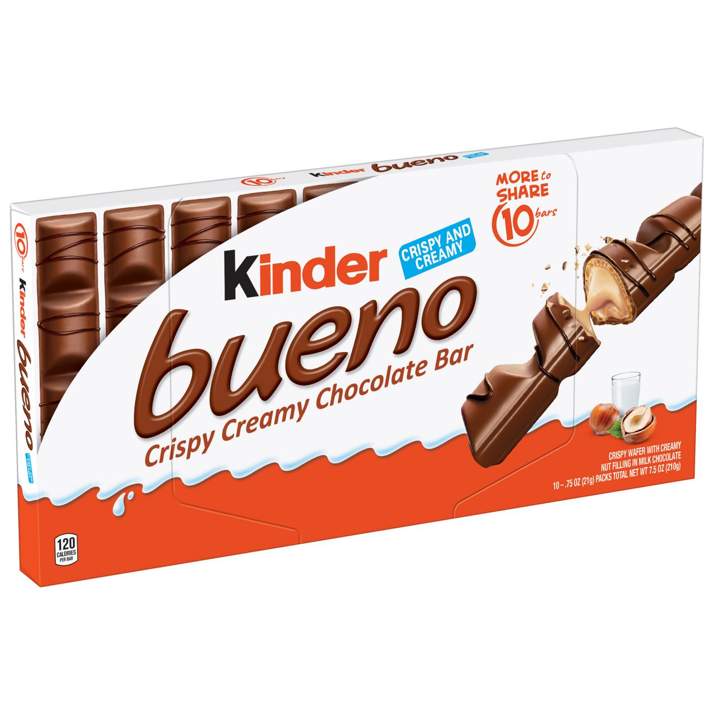 Discover the unique and irresistible taste of Kinder Bueno chocolate bars, featuring smooth milk chocolate, creamy hazelnut filling, and a crispy wafer that delivers sensational flavor in every bite. When hazelnut meets chocolate and crispy meets creamy, creating a unique experience of textures and flavors, finished with a delicate dark chocolate drizzle.Kinder Bueno isn’t just a chocolate bar. It’s an experience. One bite makes a mark. Two? You’re hooked. Intricately layered. Chocolate, Hazelnut, wafer. Effortlessly enjoyed. Two individually wrapped bars, but nothing can contain the deliciousness and elevated allure of a Kinder Bueno. Irresistibly one of a kind. Kinder Bueno.Whether you’re taking a coffee break, a study pause, gathering with friends, or settling in for movie night, Kinder Bueno is perfect for any moment. It also makes a sweet addition to Easter gift baskets, a Christmas stocking stuffer, a back-to-school treat, a Halloween trick or treat.