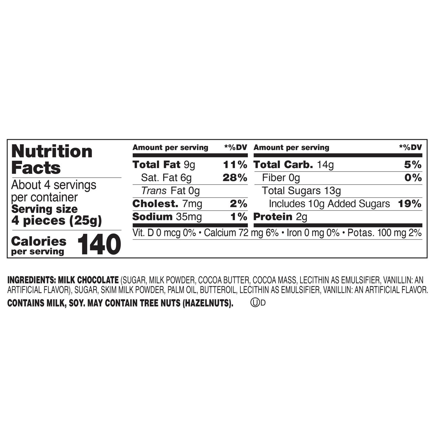 milk chocolate (sugar, milk powder, cocoa butter, cocoa mass, lecithin as emulsifier, vanillin: an artificial flavor), sugar, skim milk powder, palm oil, butteroil, lecithin as emulsifier, vanillin: an artificial flavor.Allergens and safety warnings
