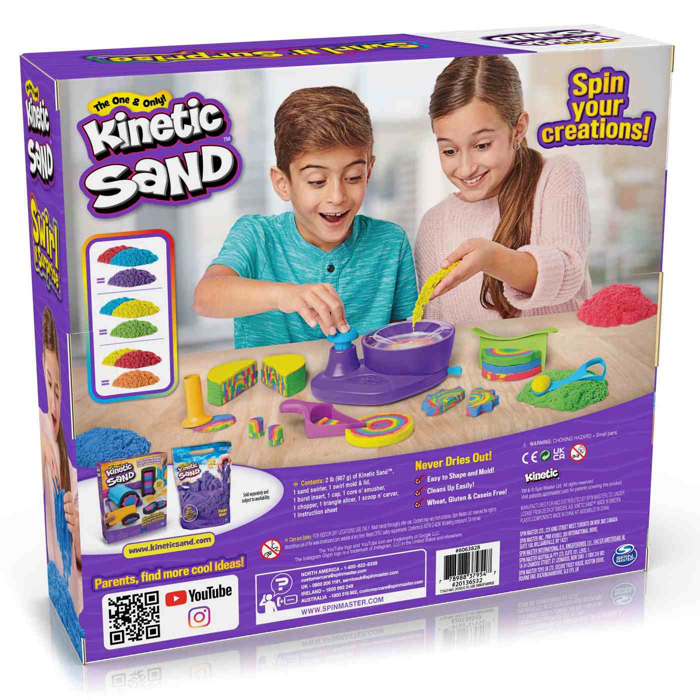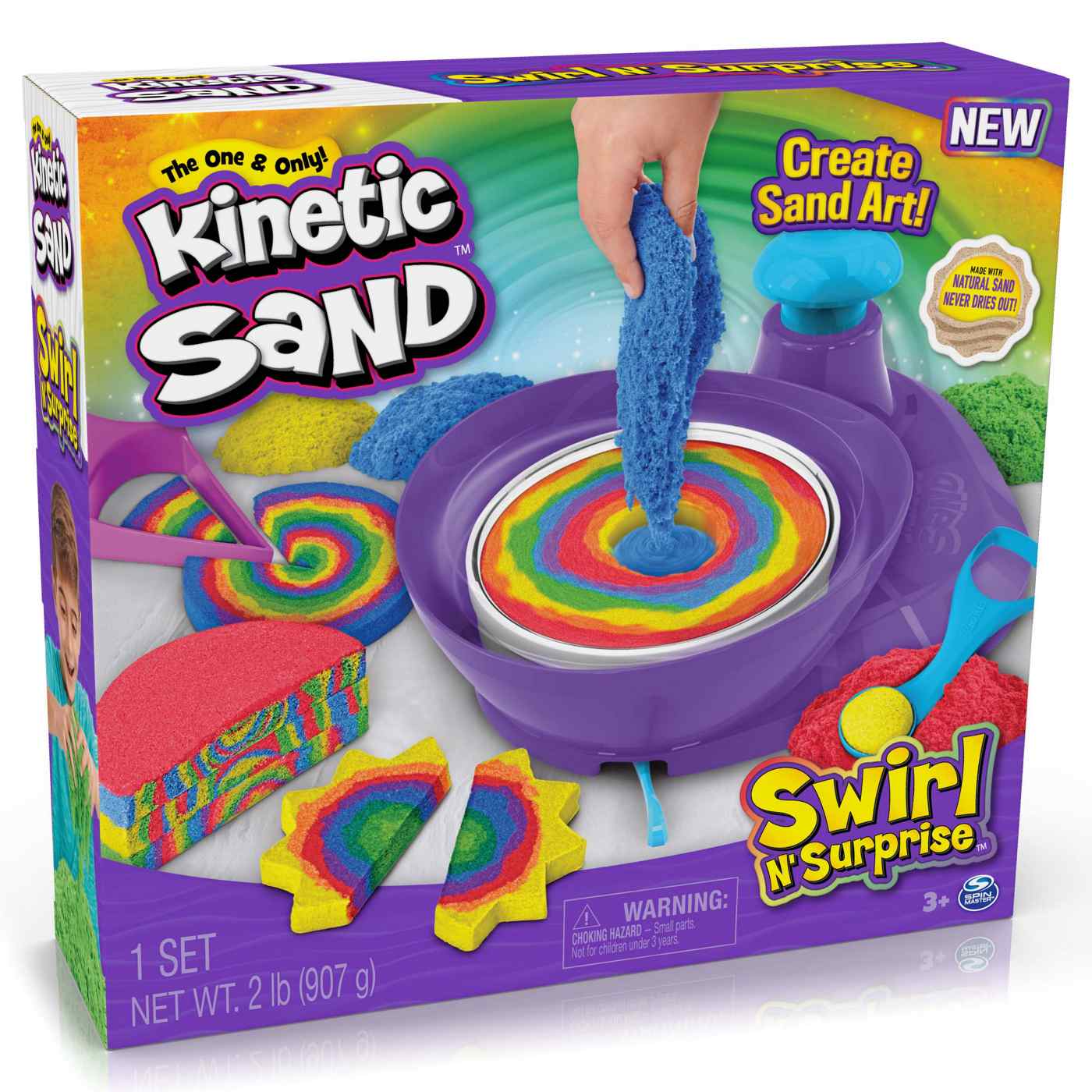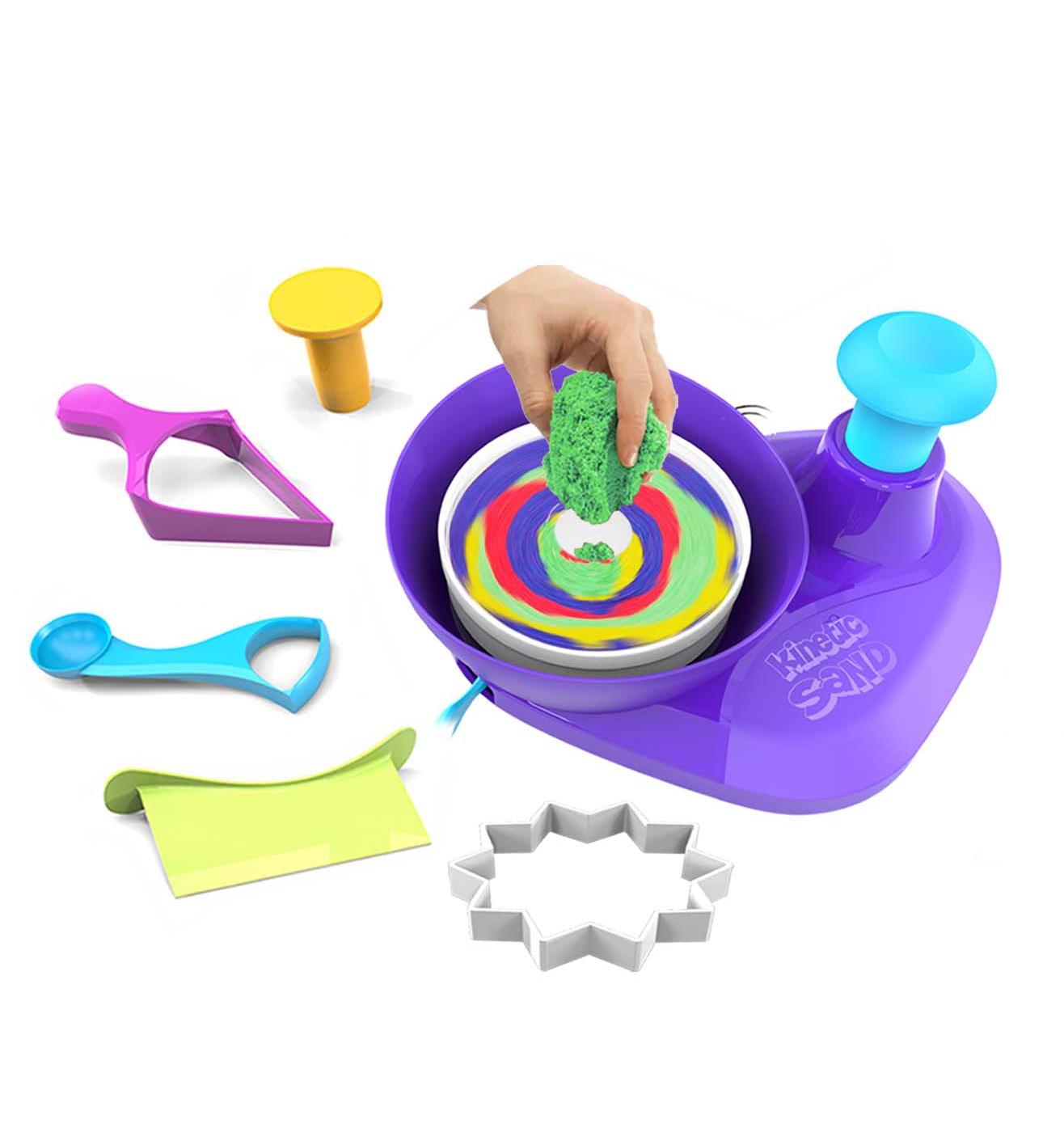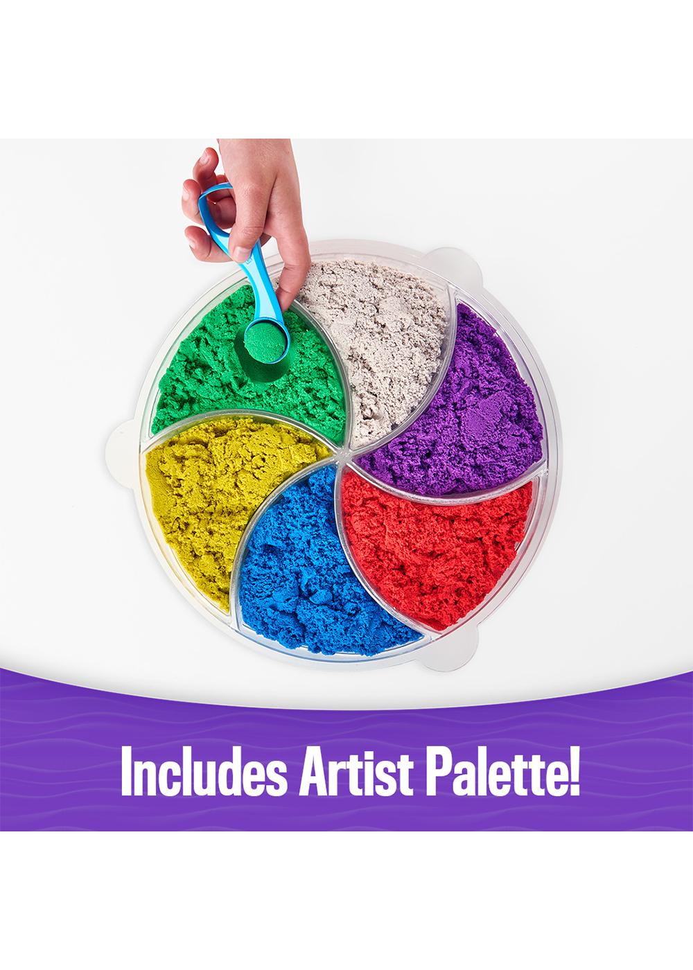 Swirl sand to magically create beautiful sand art with the Swirl N' Surprise playset! The most hands-on approach to Kinetic Sand art play, this playset lets kids flow, swirl and stack sand with 4 tools and 2 pounds of sand in red, purple, green and yellow. Fluff the sand and fill the sand swirler, close the lid for mess-free play, then press down on the pump to swirl the sand around! Watch as you reveal mesmerizing sand art designs! Swirl, carve and slice again and again – it’s so much fun! With the Kinetic Sand Swirl N’ Surprise playset, there are so many creative possibilities!