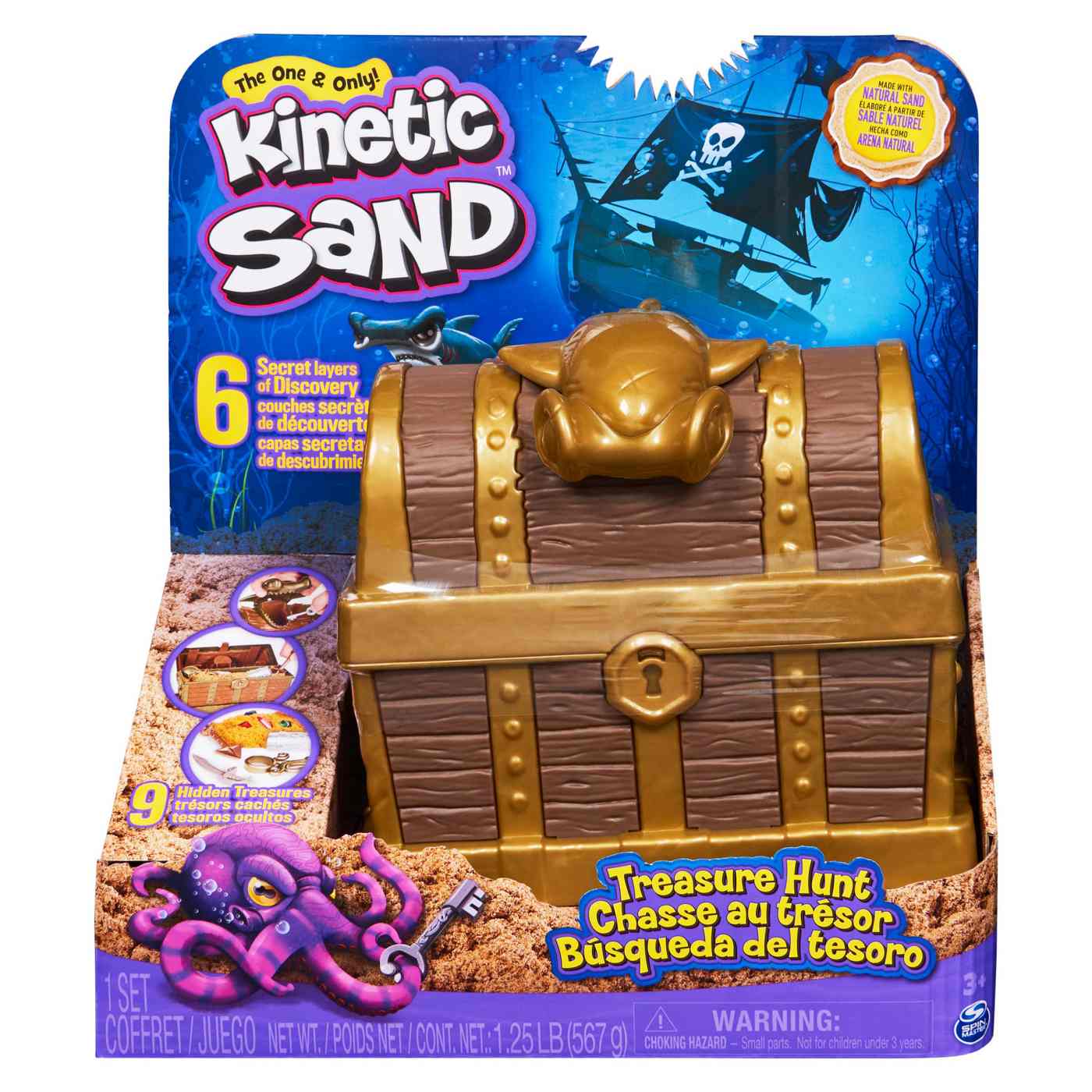 Go on an epic adventure with the Kinetic Sand Treasure Hunt! This exciting Kinetic Sand set is packed with six layers of secret reveals and features nine hidden treasures to discover! Find the key to unlock your treasure chest, then lift the lid to reveal 16 oz. of brown Kinetic Sand and a shovel tool under the lid. Dig through the sand to uncover three more surprise tools: a pirate sword to cut the sand, an octo-shaper to transform the sand, and a roller that stamps secret messages. Get a clue for your next reveal by checking out the message rolled into the sand. The roller unlocks the panel on the bottom of the chest, where you’ll find 4 oz. of rare gold Shimmer Kinetic Sand in a hidden shark mold! Slice and transform the gold sand with your tools to find your remaining treasures – five colorful gems!