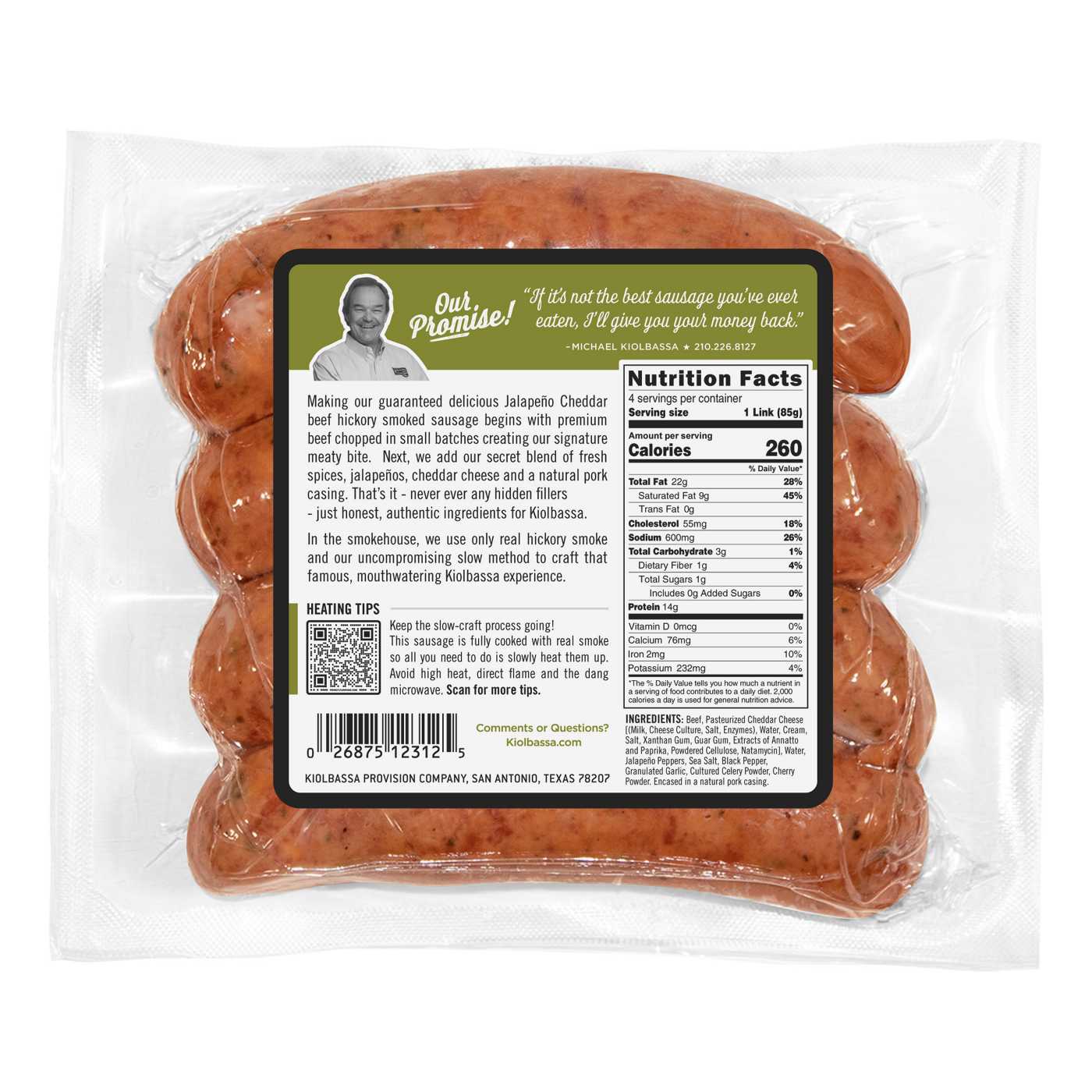 Kiolbassa Jalapeño Cheddar Beef Hickory Smoked Sausage, 4 ct
