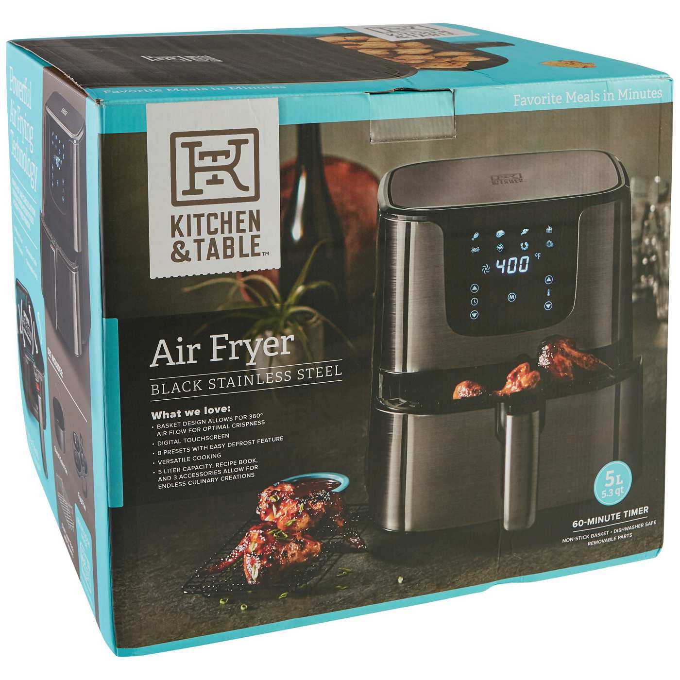 Our Kitchen & Table by H-E-B™ 5L Digital Air Fryer combines sleek design and quality performance. It's unique 360° air flow basket design which allows for optimal crispness!