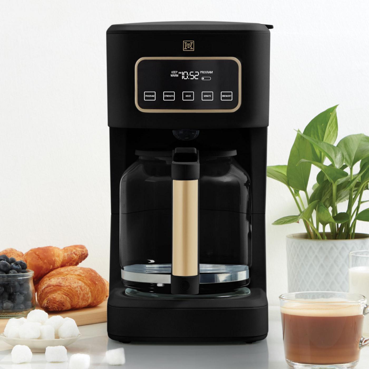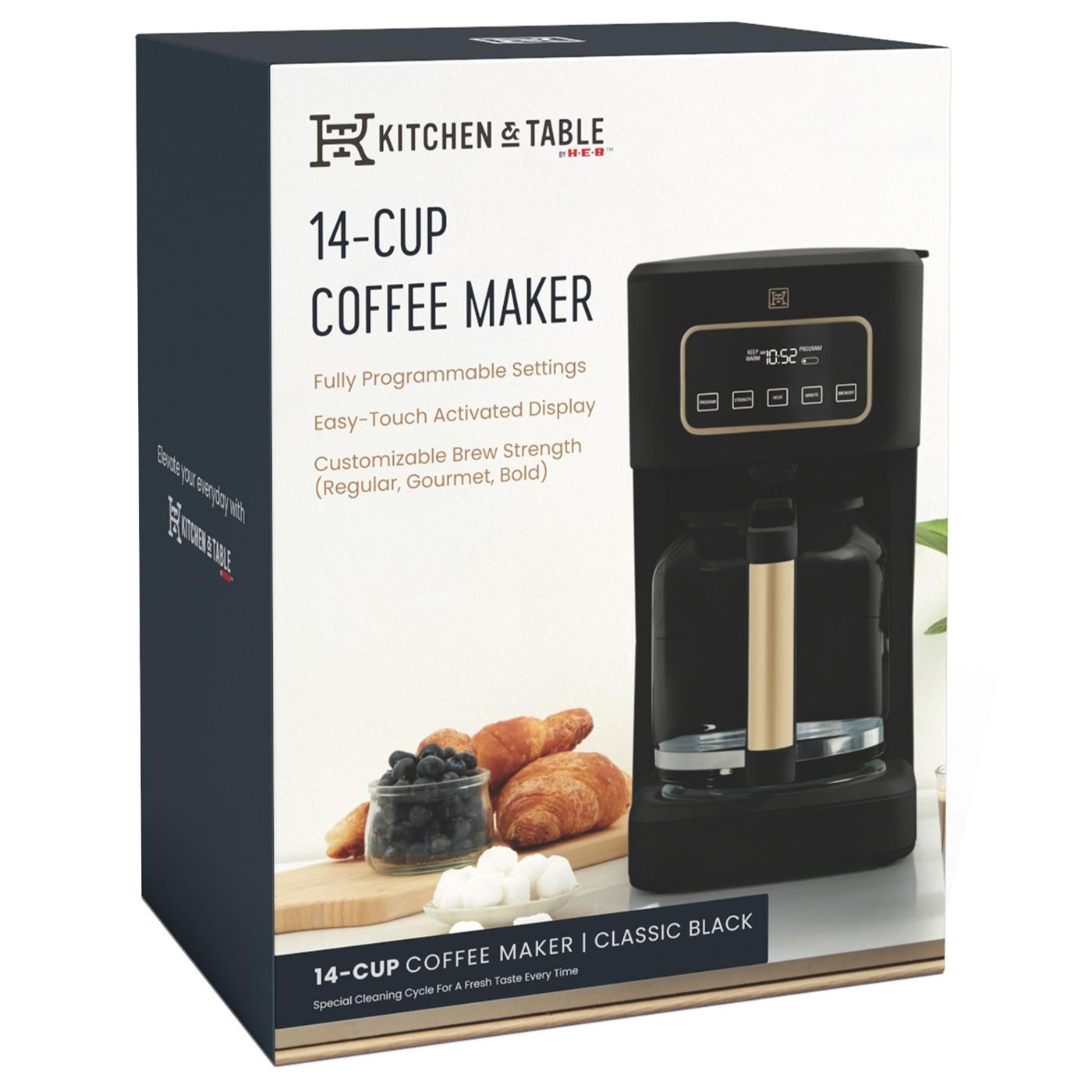 Stay caffeinated with this Kitchen & Table by H-E-B 14-cup coffee maker. With fully programmable settings, you can customize your coffee’s brew and choose between regular, gourmet or bold. The pause-and-serve feature allows you to grab a cup before brewing is complete and the keep warm feature keeps it hot for up to 4 hours. Best of all, the reusable filter basket means you no longer have to remember paper filters.